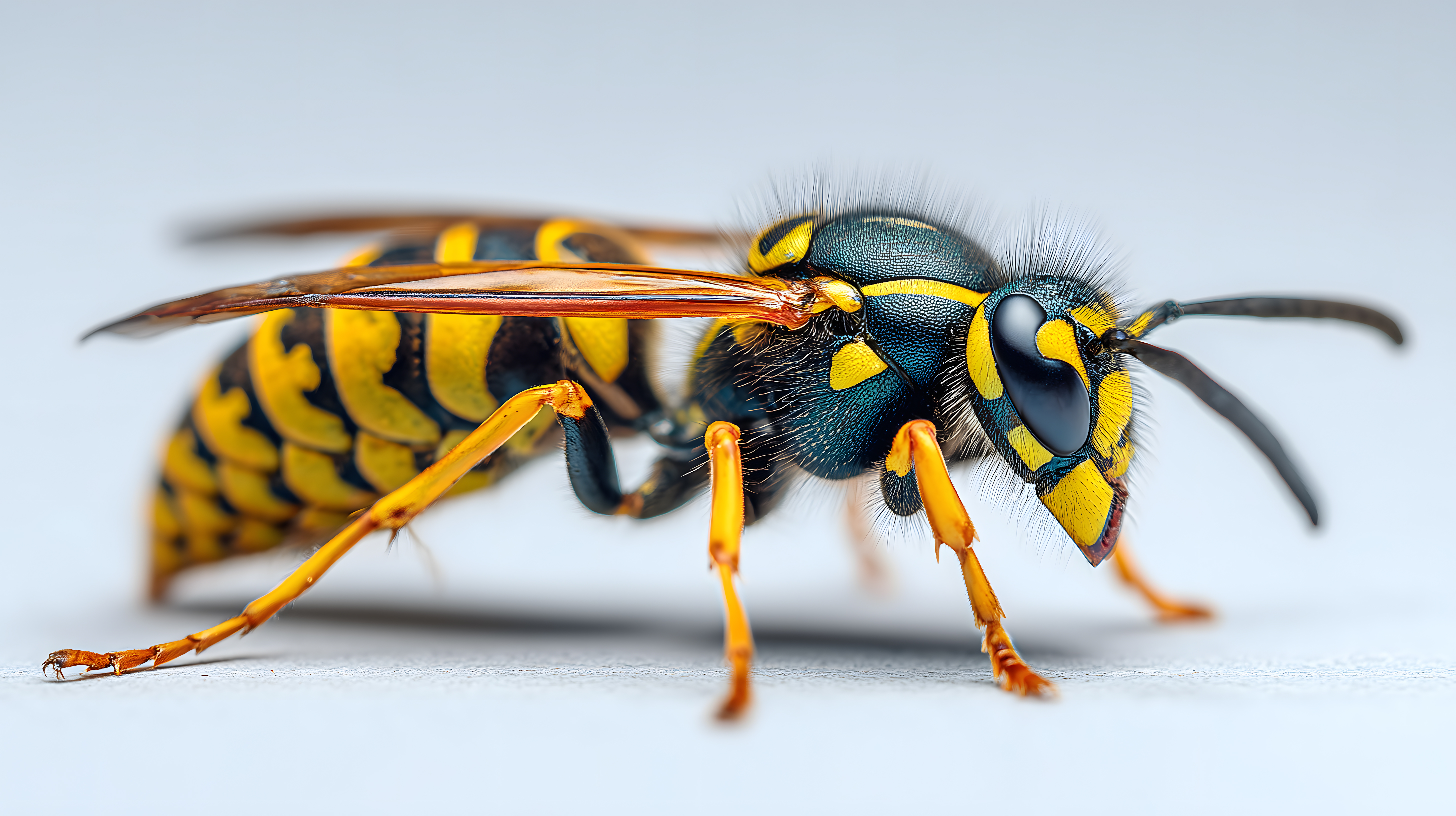 Das Bild zeigt eine detailreiche Nahaufnahme einer bunten Wespe auf einem hellen, neutralen Hintergrund. Die Wespe ist scharfgezeichnet, sodass die feinen Strukturen und Behaarung des Insekts deutlich zu erkennen sind. Die Färbung der Wespe ist auffällig, mit gelb-schwarzen Streifen auf dem Körper und dunklen Facettenaugen. Das Foto wurde vermutlich in einem Fotostudio aufgenommen, um die Details optimal in Szene zu setzen. Dieses hochauflösende, rechtefreie Stockfoto eignet sich ideal für den Einsatz in Blogs, Newslettern, Social-Media-Beiträgen oder Werbematerialien rund um Themen wie Tiere, Natur oder Makrofotografie.