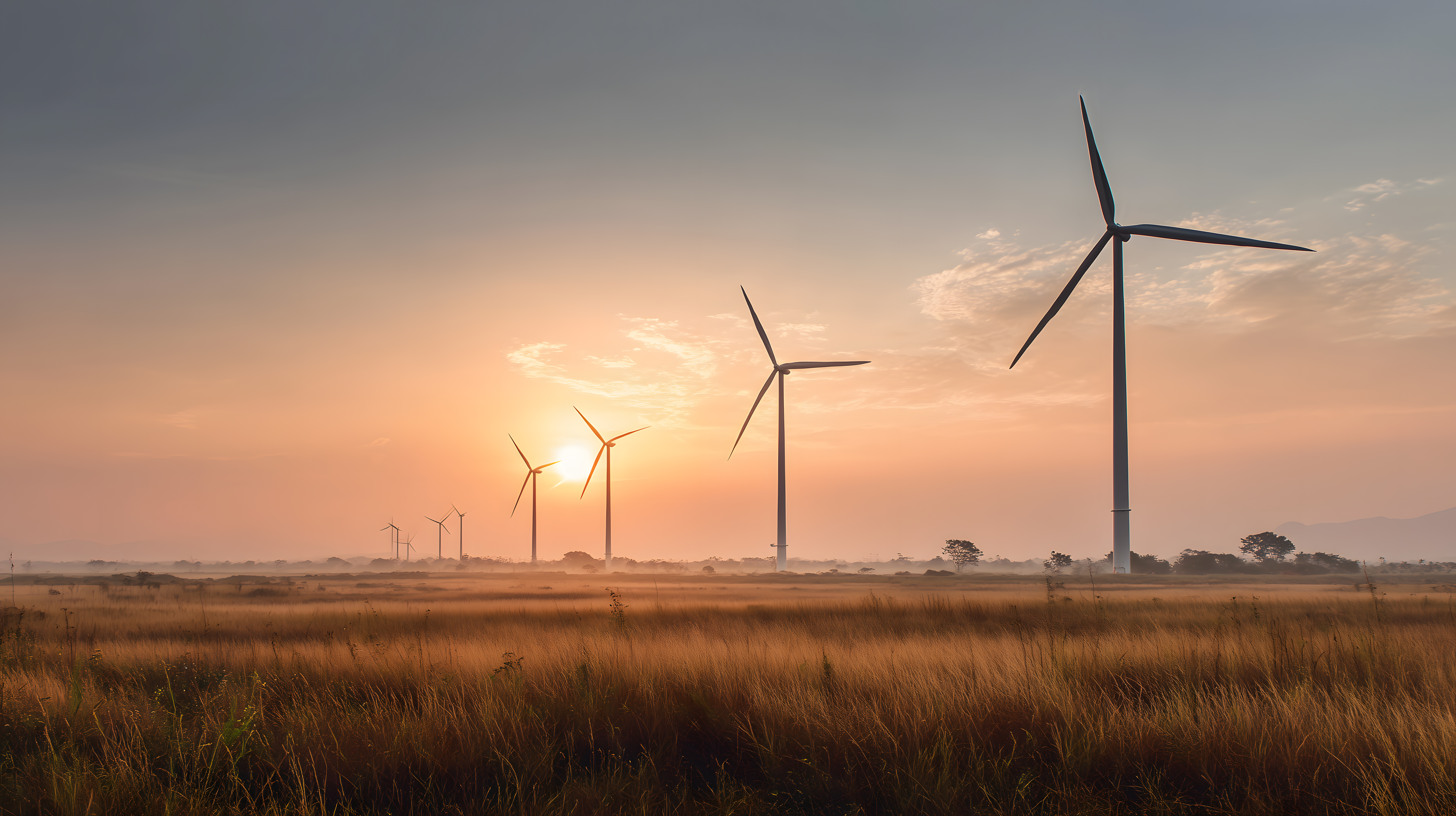 Dieses Foto zeigt eine beeindruckende Landschaft mit mehreren Windrädern, die sich majestätisch vor einem atemberaubenden Sonnenaufgang am Horizont abheben. Die Windturbinen dominieren das ländliche Panorama, umgeben von einem weiten Feld mit hohem Gras. Der Himmel ist von warmen, orangefarbenen Tönen durchzogen, die eine ruhige und serene Stimmung vermitteln. Das Bild symbolisiert die Nutzung erneuerbarer Energien und den Übergang zu einer nachhaltigen Energiegewinnung. Dieses Stockfoto in hoher Auflösung eignet sich hervorragend für Blog-Beiträge, Newsletter oder Social-Media-Veröffentlichungen rund um Umweltschutz, Ökologie und erneuerbare Energien. Es steht unter der Creative-Commons-Lizenz zur kostenlosen Verwendung zur Verfügung.