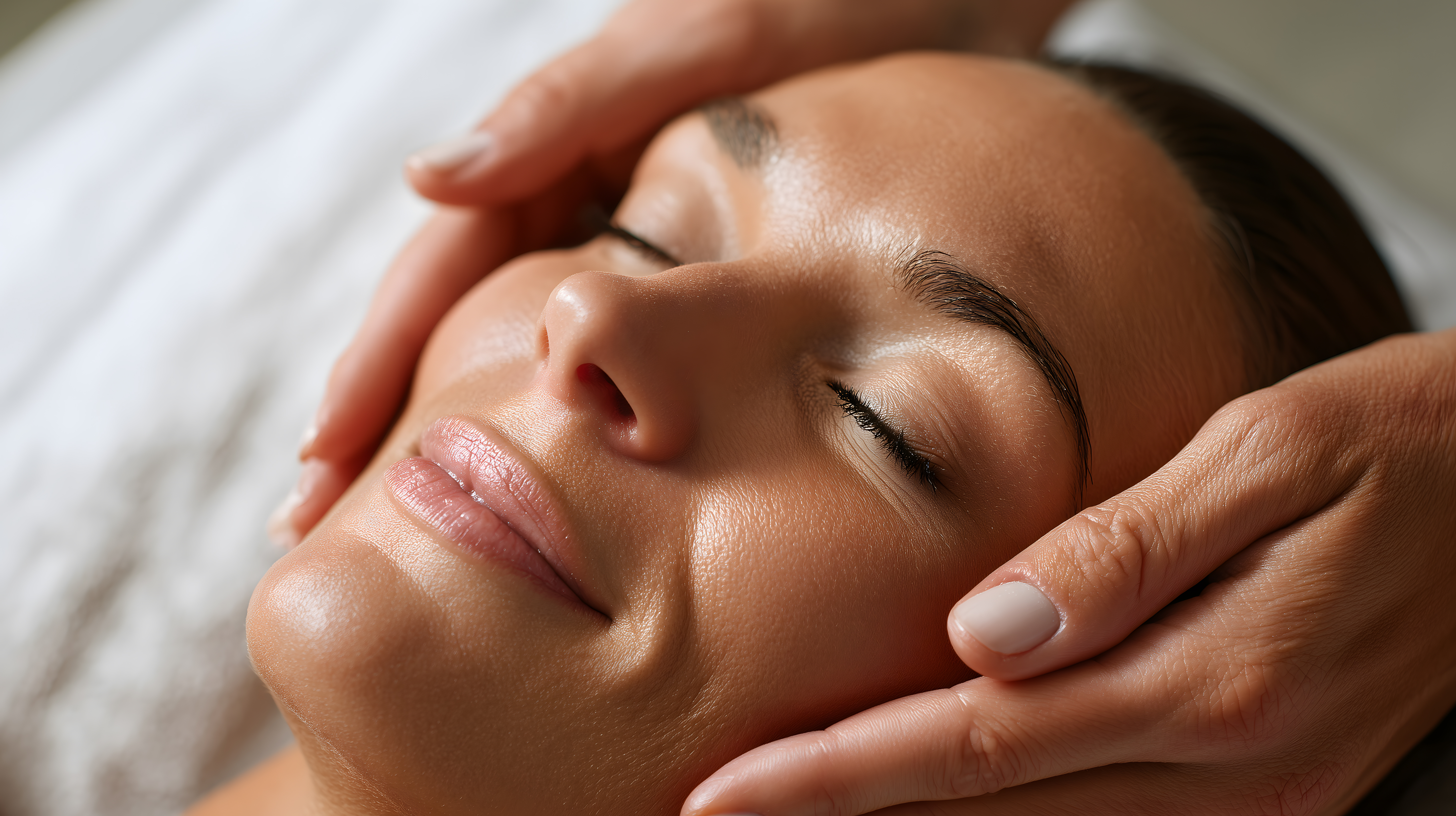 Das Bild zeigt eine Frau, die in einer ruhigen und entspannenden Spa-Umgebung eine Gesichtsmassage genießt. Sie liegt mit geschlossenen Augen und einem friedlichen Gesichtsausdruck auf einer weißen Liege. Ihre Haut erscheint strahlend und gepflegt. Die Hände einer anderen Person sind sanft auf ihr Gesicht gelegt, was die Szene der Entspannung und Pflege unterstreicht. Das Bild vermittelt eine Atmosphäre der Ruhe, Schönheit und Selbstfürsorge, die perfekt für den Einsatz in Spa-Werbekampagnen, Beautyblog-Artikeln oder Wellness-Newslettern geeignet ist. Dieses hochauflösende Foto ist als kostenloses Stockbild unter Creative-Commons-Lizenz verfügbar.