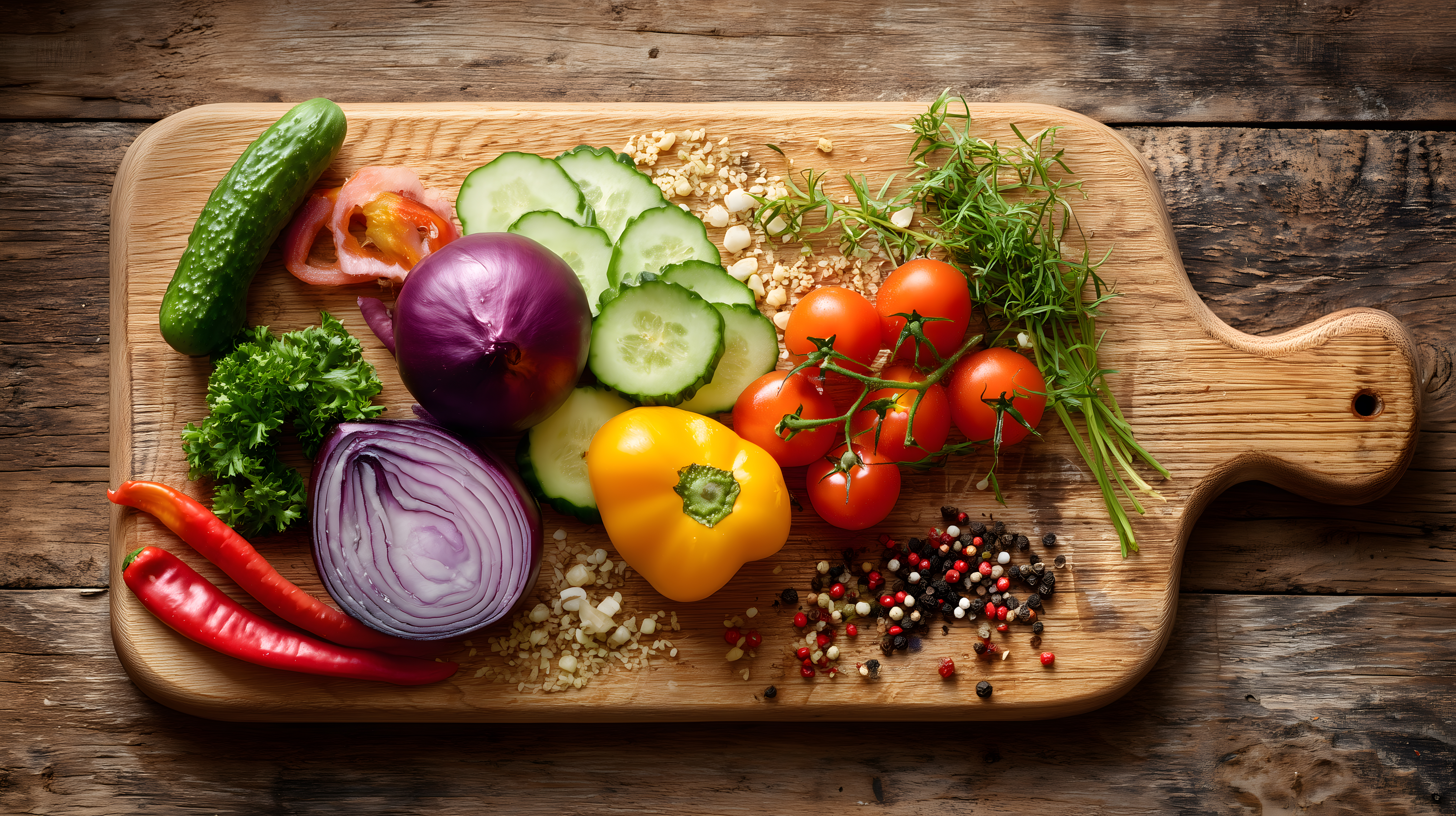 Dieses Foto zeigt eine Anordnung frischen Gemüses auf einem rustikalen Holzbrett. Im Zentrum befinden sich verschiedenfarbige Tomaten, Gurken, Paprika und Zwiebeln. Umgeben sind sie von Kräutern, Gewürzen und dekorativen Elementen wie Pfefferkörnern. Das Arrangement in warmen, erdigen Tönen vermittelt ein Gefühl von Natürlichkeit und Frische. Dieses Stockfoto eignet sich hervorragend für Beiträge zu Themen wie Ernährung, Kochen, gesunder Lebensstil oder Rezeptvorschläge. Mit seiner hohen Auflösung und Creative-Commons-Lizenz können Unternehmen, Blogger oder Social-Media-Kanäle das Bild kostenfrei und rechtssicher in ihren Inhalten verwenden.