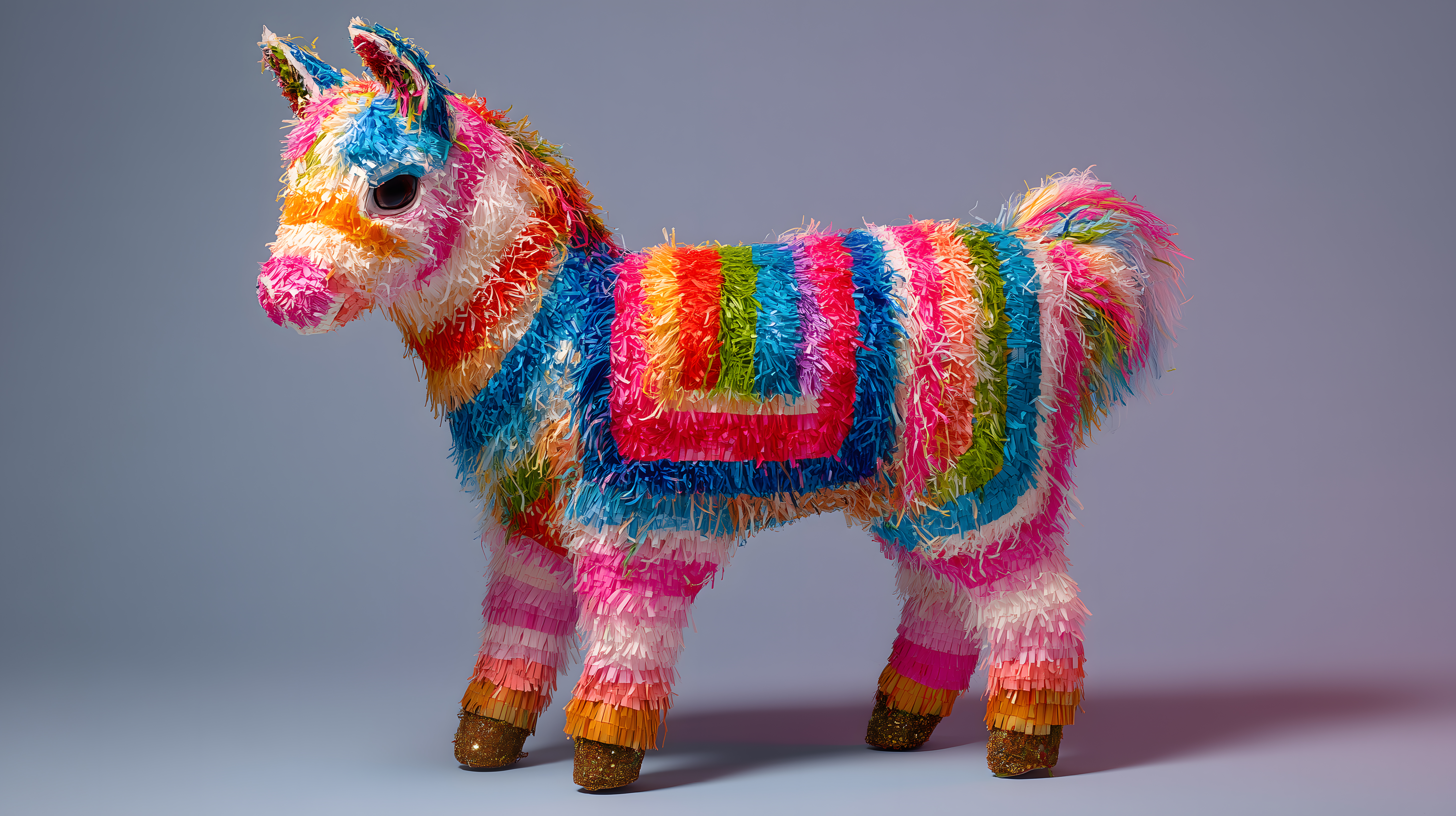 Das Bild zeigt eine bunte, kunstvolle Piñata-Figur in Form eines Einhorns vor einem grauen Hintergrund. Die Piñata ist in einer Vielzahl an Regenbogenfarben wie Pink, Blau, Orange und Grün gestaltet und mit farbigen Fransen und Elementen verziert. Sie strahlt eine fröhliche, verspielt-dekorative Atmosphäre aus und wäre ideal als Dekoration für Kindergeburtstage, Partys oder andere festliche Anlässe geeignet. Dieses hochauflösende Stockfoto unter Creative-Commons-Lizenz kann kostenlos für Blogs, Websites, Social-Media-Beiträge und Werbematerialien verwendet werden.