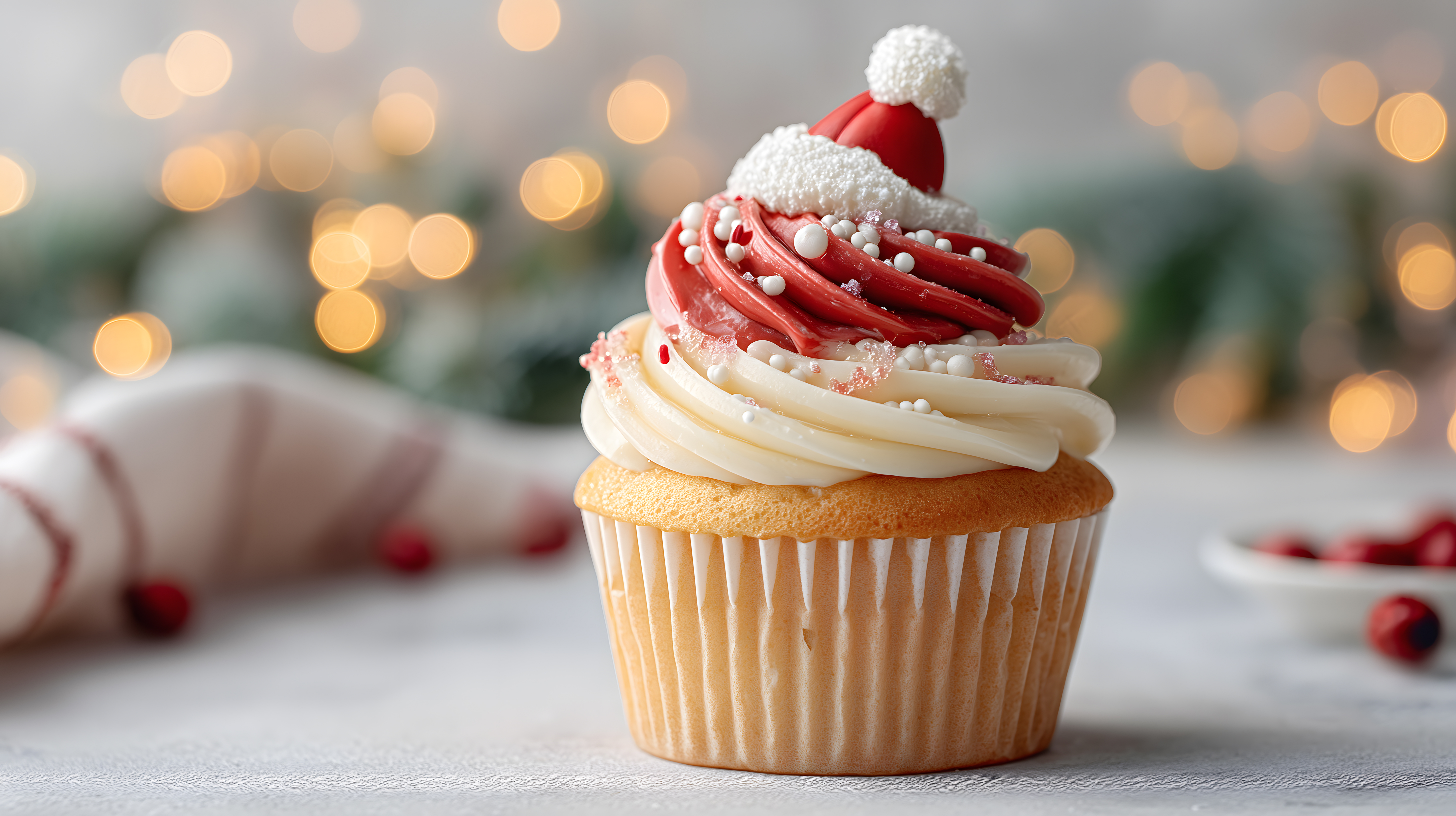 Dieses festliche Weihnachtscupcake ist ein wahrer Blickfang. Auf einem fluffigen Vanillecupcake thront eine Haube aus cremigem, rot-weißem Topping, dekoriert mit einer Pudermütze. Die stimmungsvolle Beleuchtung im Hintergrund lässt das Gebäck warm und einladend erscheinen. Dieses hochwertige Stockfoto eignet sich hervorragend für Weihnachtsdekorationen, Feiertags-Posts in sozialen Medien oder als Titelbild für saisonale Blogbeiträge. Das Foto ist in hoher Auflösung verfügbar und unter einer Creative-Commons-Lizenz kostenlos nutzbar.
