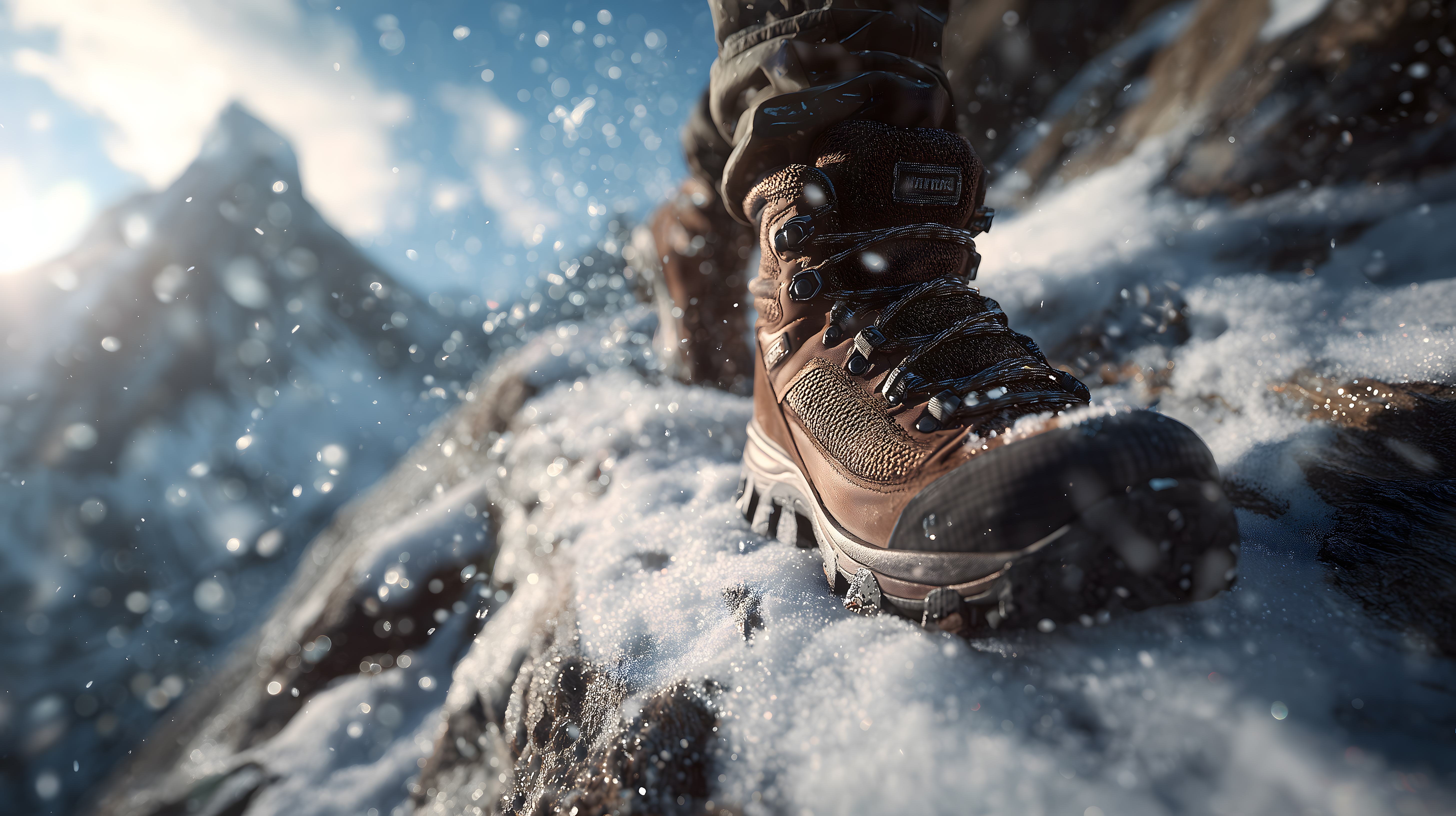 Das Bild zeigt den Fuß eines Wanderers, der auf einem verschneiten Bergpfad läuft. Der robuste Wanderschuh mit Profil-Sohle ist perfekt für die winterliche Gebirgslandschaft gerüstet. Im Hintergrund sind schneebedeckte Gipfel zu sehen, die von der Sonne angestrahlt werden und einen atemberaubenden Kontrast zum dunklen Schuh bieten. Die detailreiche Aufnahme vermittelt die Kälte und Herausforderung des Winterwanderns und eignet sich hervorragend für Outdoor-Blogs, Winter-Reise-Portfolios oder Werbe-Kampagnen für warme Bergausrüstung. Dieses hochauflösende Stockfoto unter Creative-Commons-Lizenz ist kostenlos für private und kommerzielle Zwecke nutzbar.