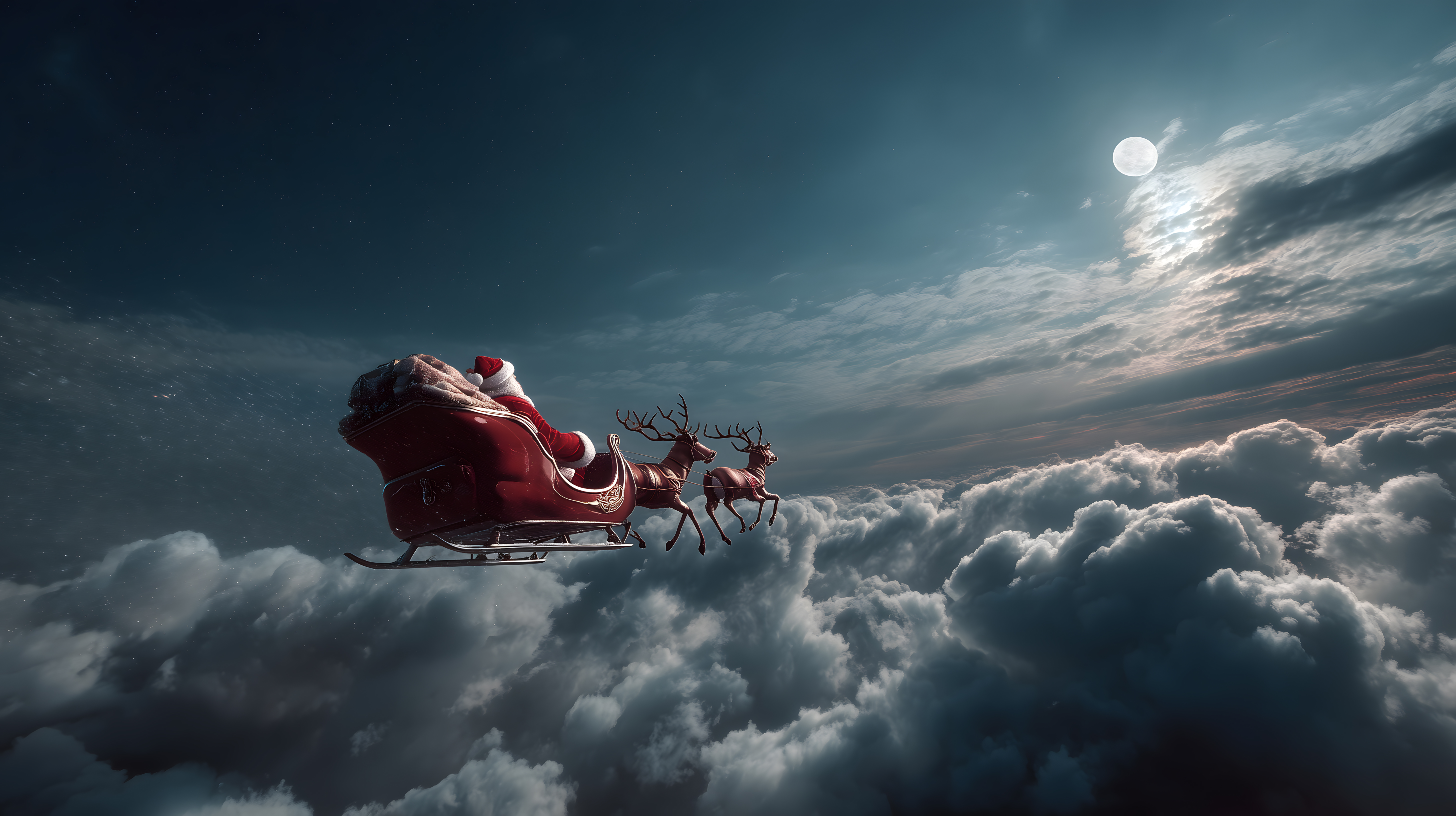 Das Bild zeigt den Weihnachtsmann, der in seinem roten Schlitten über eine mystische Wolkenlandschaft schwebt. Der Schlitten wird von Rentieren gezogen, die vor einem dramatischen Himmel mit Vollmond dahinfliegen. Die Szene hat eine märchenhafte, fantastische Ausstrahlung und vermittelt eine stimmungsvolle, festliche Atmosphäre. Das Foto eignet sich hervorragend als kostenlose, hochauflösende Bildressource für Weihnachts-Blogs, Newsletters, Social-Media-Posts oder Werbekampagnen. Es steht unter der Creative-Commons-Lizenz zur freien Verwendung zur Verfügung.