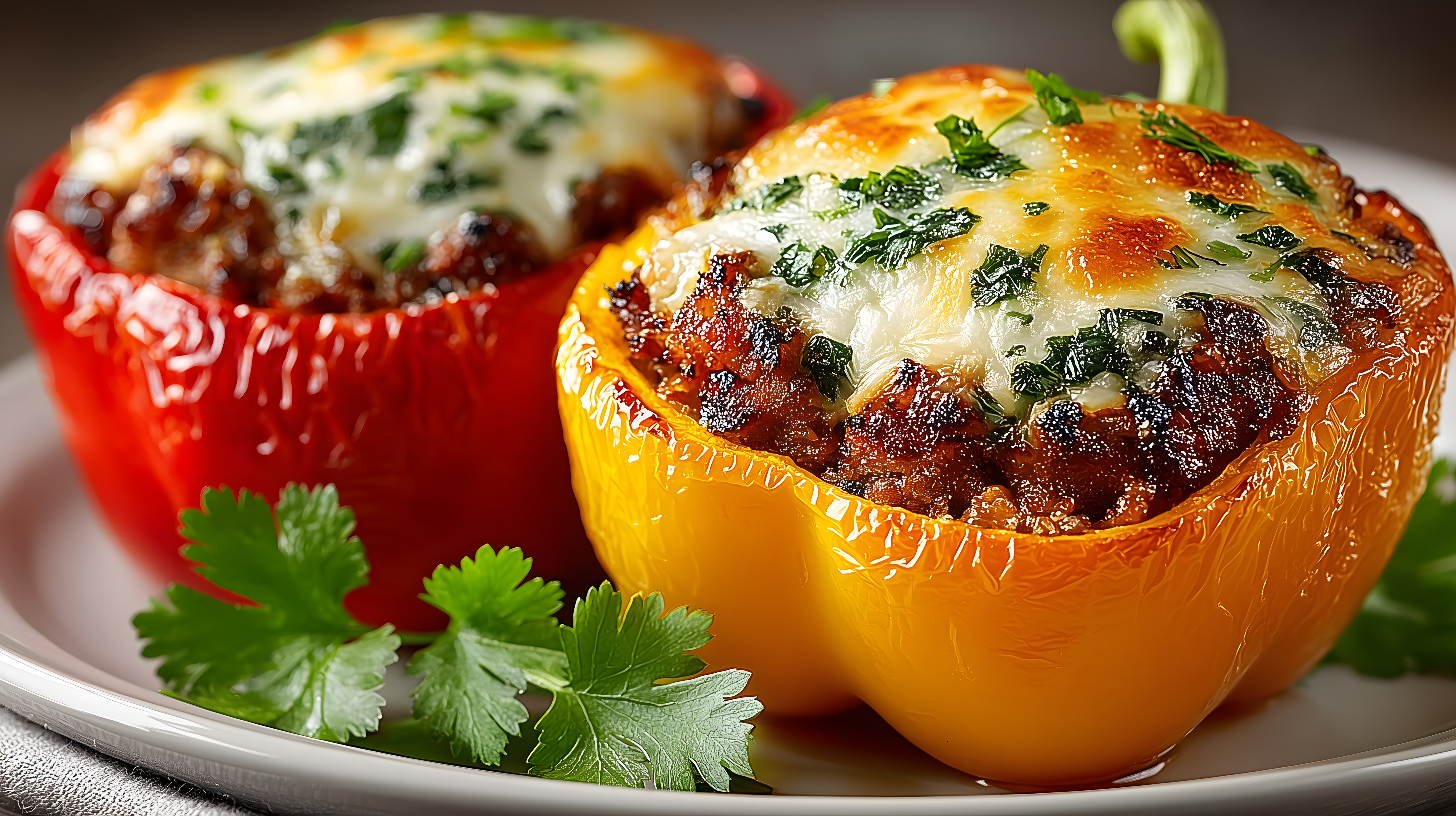 Das Bild zeigt zwei appetitlich aussehende, gefüllte Paprikaschoten, die mit einer braunen Hackfleisch-Käse-Mischung gefüllt und anschließend überbacken wurden. Die Schoten haben eine schöne, knusprige Oberfläche und sind auf einem hellen Teller angerichtet, umgeben von frischen Petersilienblättern. Die Farbpalette aus kräftigem Rot und strahlendem Orange verleiht dem Gericht einen mediterranen, einladenden Charakter. Dieses Foto eignet sich hervorragend als visuelle Begleitung zu Rezeptbeiträgen, Kochbüchern oder Lebensmittelwerbung. Als kostenloses Stockfoto in hoher Auflösung und unter Creative-Commons-Lizenz ist es vielseitig einsetzbar.