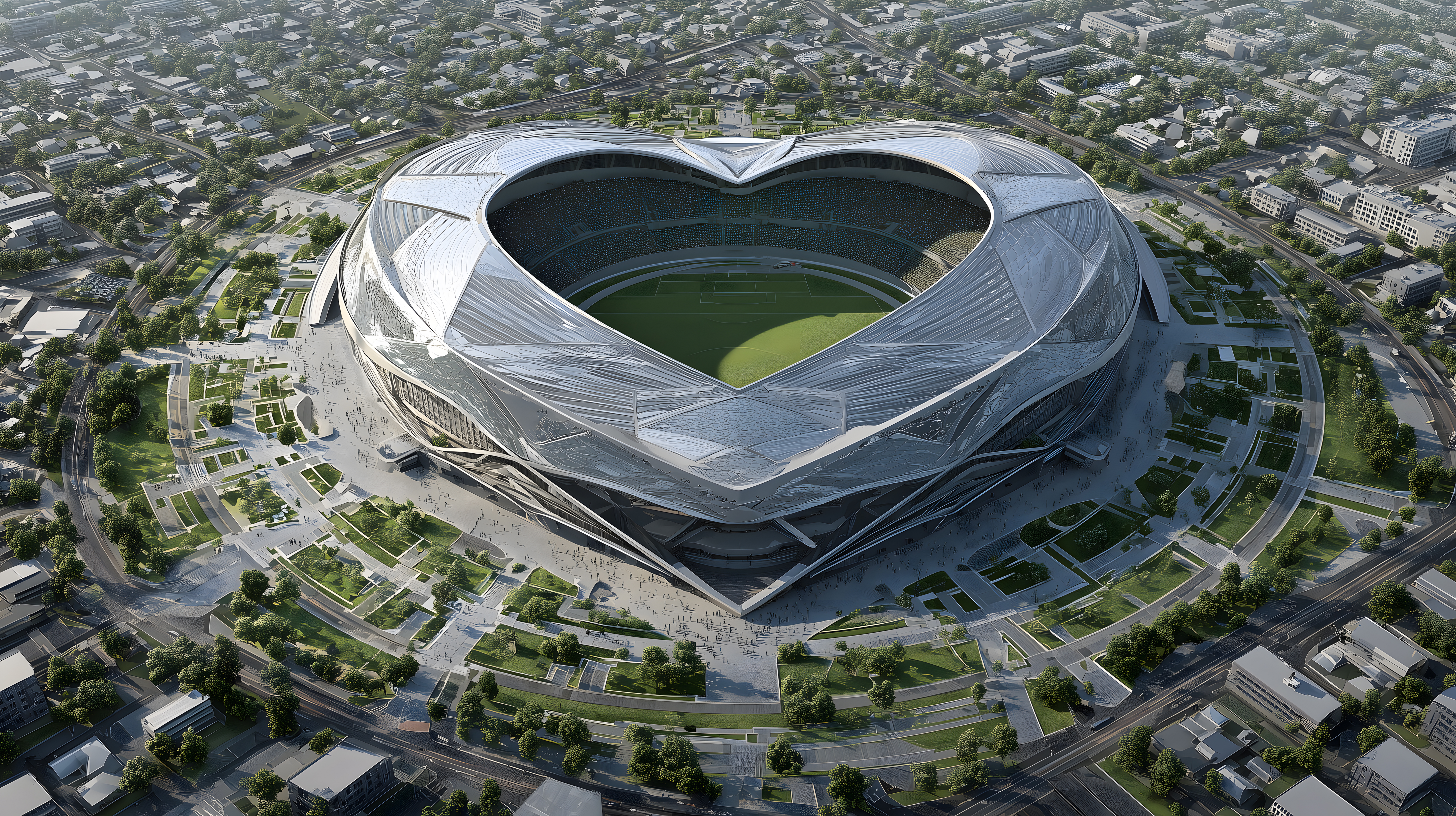 Dieses faszinierende Luftbild zeigt ein futuristisches Fußballstadion in Herzform. Das Stadion ist von modernen, dynamischen Formen geprägt und wirkt aus der Vogelperspektive beinahe organisch in die Umgebung eingebettet. Die geometrischen Strukturen, die das Stadion umhüllen, verleihen ihm einen technologischen und zukunftsweisenden Charakter. Umgeben von Grünflächen und Infrastruktur bietet es eine beeindruckende Symbiose zwischen Architektur und Natur. Dieses hochauflösende, kostenlose Stockfoto eignet sich hervorragend für Projekte im Bereich Stadtplanung, Sporteinrichtungen, Architektur oder futuristische Visualisierungen unter einer Creative-Commons-Lizenz.