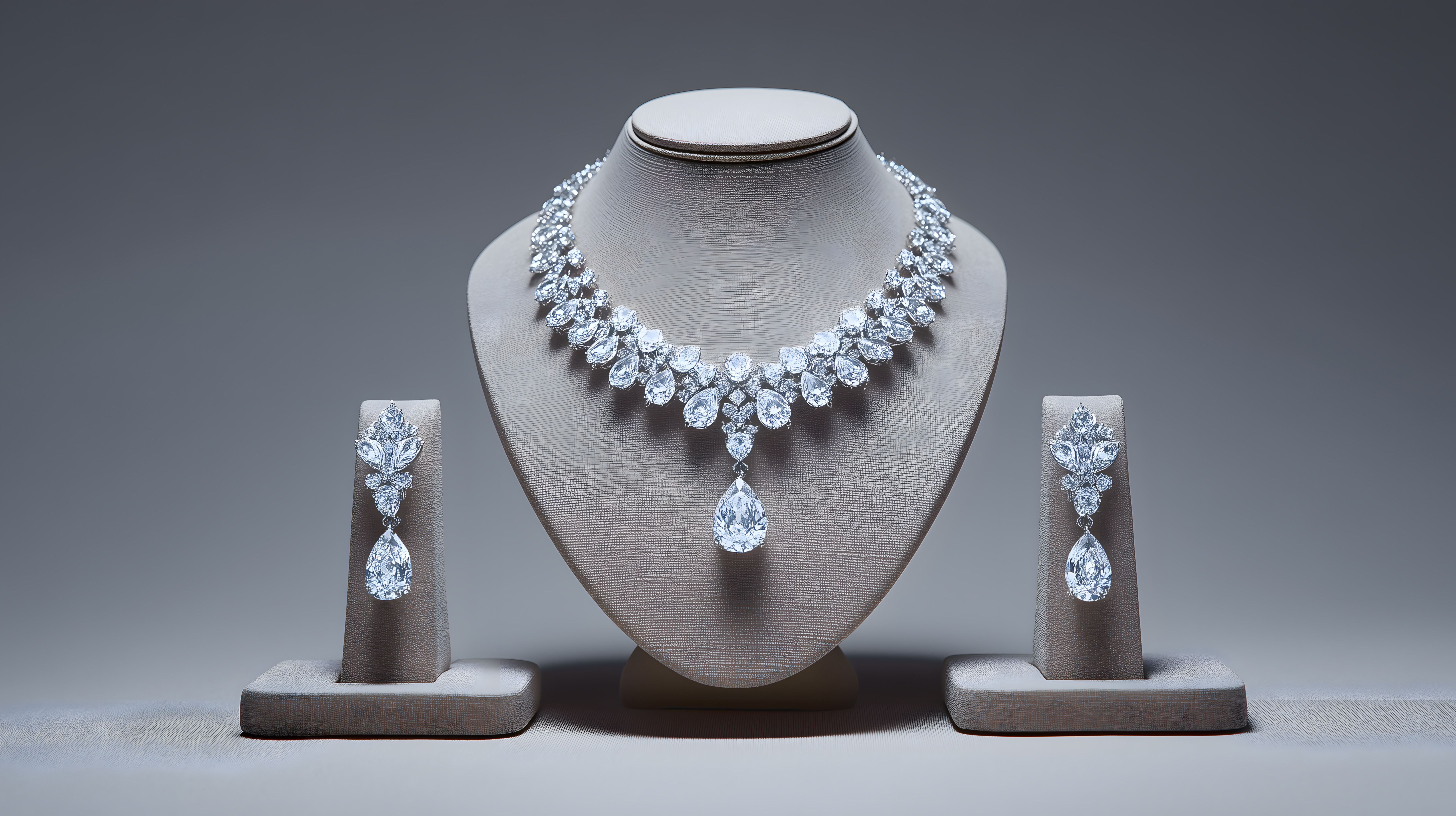 Dieses Foto zeigt ein exklusives Diamantenschmuck-Set bestehend aus einer glänzenden Halskette und passenden Ohrringen. Der Schmuck ist mit zahlreichen funkelnden Diamanten in Tropfenform besetzt, die in einem eleganten Design angeordnet sind. Das Set strahlt pure Luxus und Raffinesse aus und wäre perfekt für glamouröse Anlässe wie Hochzeiten, rote Teppiche oder Gala-Veranstaltungen. Als kostenloses Stockfoto in hoher Auflösung eignet es sich hervorragend für Verwendung in Blogbeiträgen, Newslettern, Social-Media-Posts oder Werbematerialien unter Creative-Commons-Lizenz.