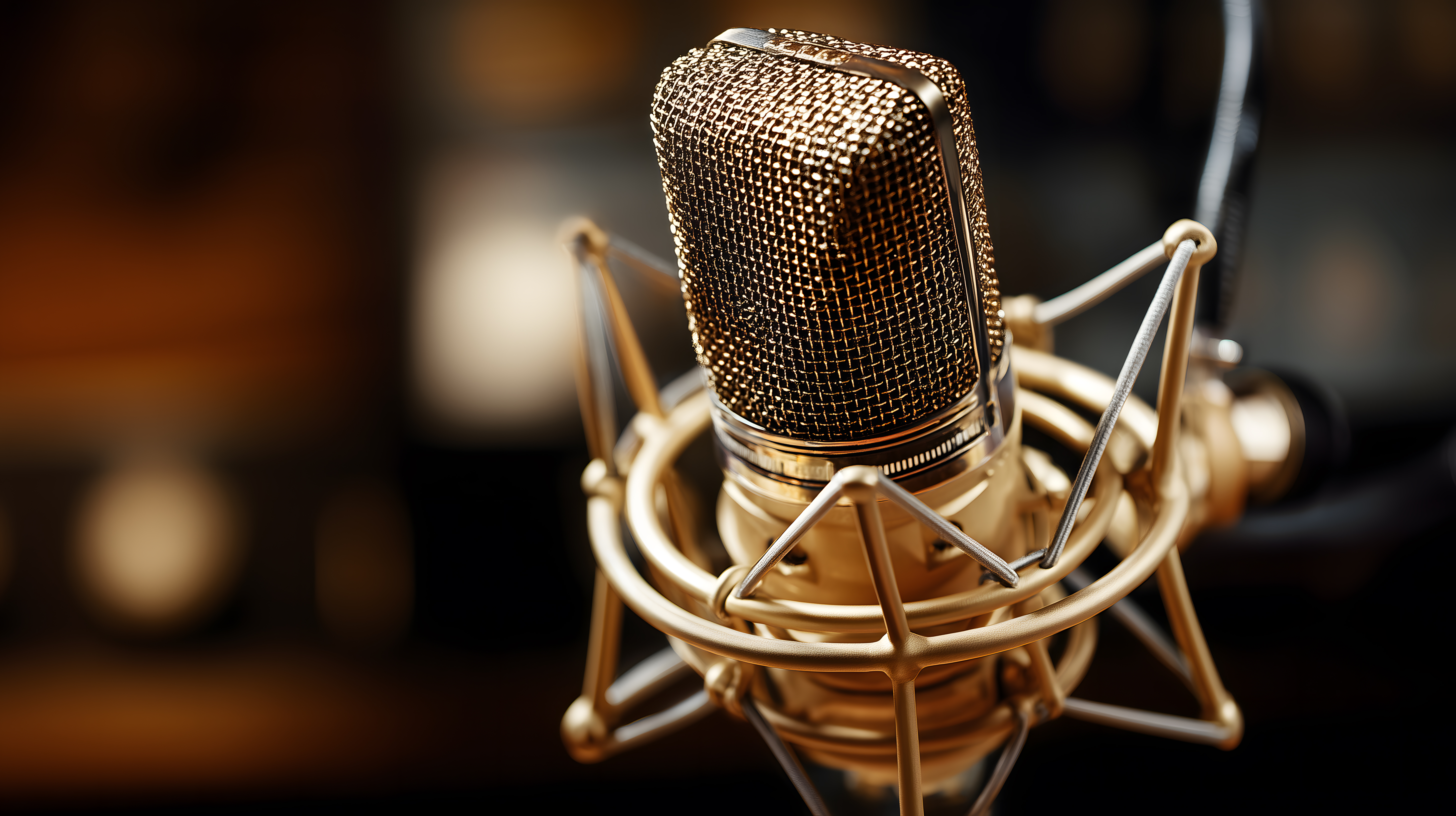 Dieses hoch detaillierte Foto zeigt ein goldenes Studiomikrofon aus der Nähe. Das Mikrofon befindet sich in einem dunklen Umfeld, was den Fokus auf das glänzende Metallgehäuse und das feinmaschige Schutzgitter lenkt. Die warme Beleuchtung verleiht dem Mikrofon einen vintage und professionellen Charakter, der perfekt für Tonaufnahmen in Tonstudios, für Podcasts, Musikproduktion oder Radioarbeit geeignet ist. Als hochwertiges Stockfoto in hoher Auflösung eignet es sich hervorragend für vielfältige Einsatzzwecke, wie etwa Blogbeiträge, Social-Media-Posts oder Werbematerialien. Das Bild steht unter einer kostenlosen Creative-Commons-Lizenz zur Verfügung.