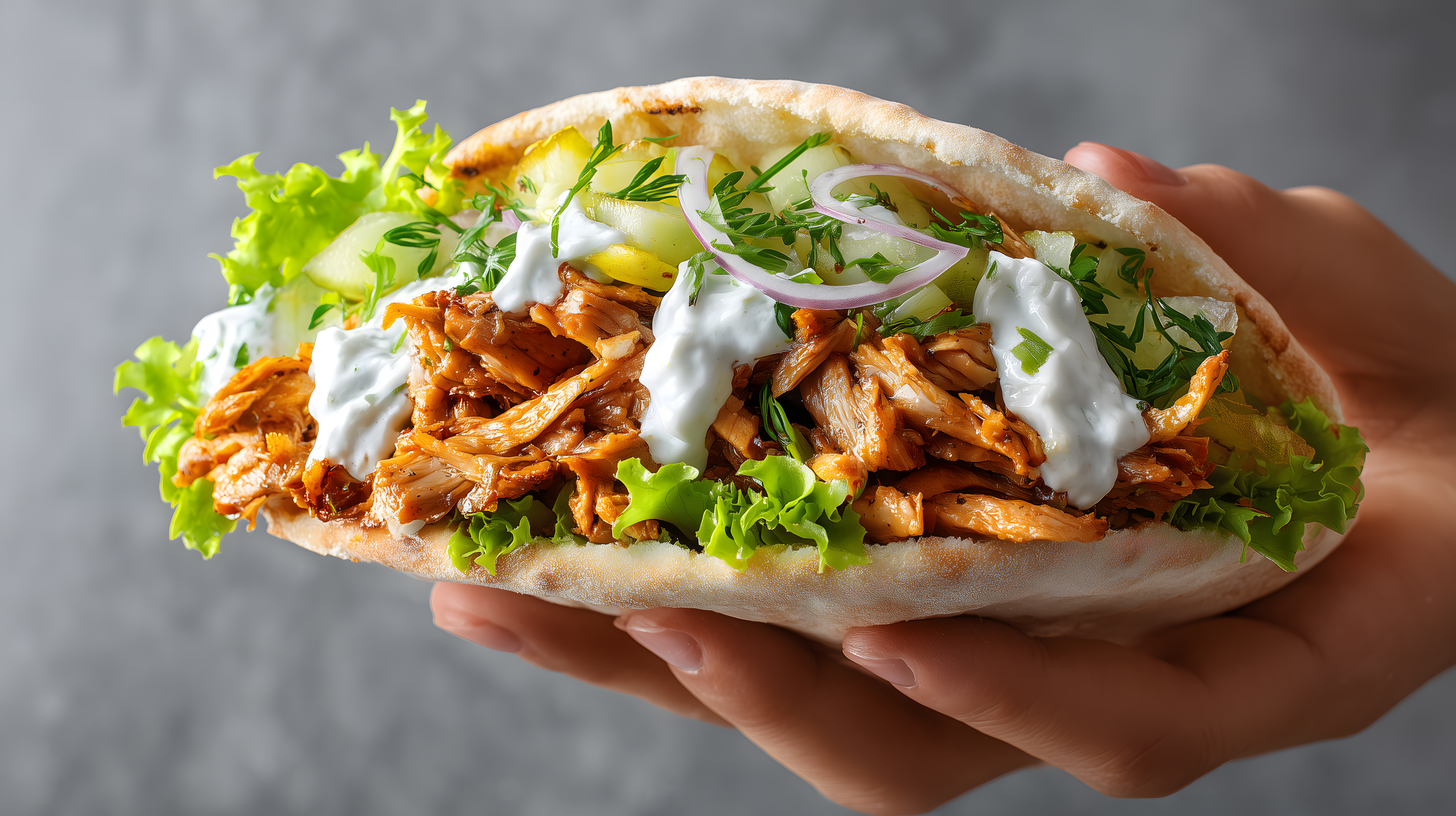 Das Bild zeigt einen leckeren Döner in Pitabrot. Das Fladenbrot ist gefüllt mit saftigen, gewürzten Hähnchenstücken, frischem grünem Salat, Zwiebeln und einer cremigen Joghurtsoße. Das Gericht sieht äußerst appetitlich und frisch zubereitet aus. Diese hochauflösende Aufnahme eignet sich hervorragend als kostenloses Stockfoto für Publikationen in Blogs, Newslettern, Social Media oder Werbung unter Creative-Commons-Lizenz.
