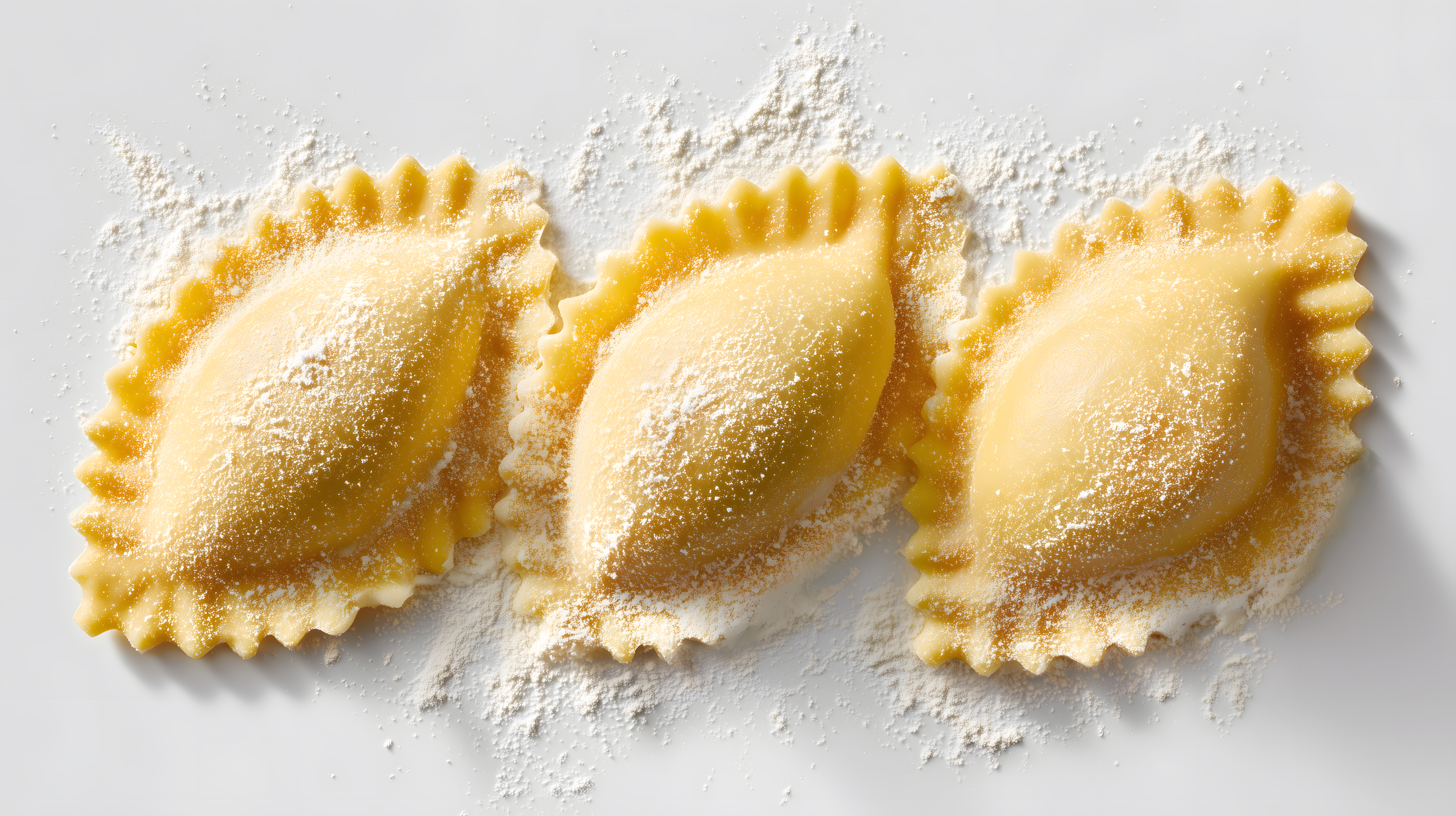 Dieses Foto zeigt drei appetitlich aussehende hausgemachte Ravioli, die auf einer weißen Oberfläche mit Mehlstaub bedeckt sind. Die Ravioli haben einen gezackten Rand und eine goldgelbe Farbe, die auf ihre frische Zubereitung hindeutet. Das Bild präsentiert das Lebensmittel in einem rustikalen Stil und könnte perfekt für Rezepte, Kochbücher, Foodblogs oder Werbekampagnen rund um italienische Küche und hausgemachte Pasta verwendet werden. Als kostenloses hochauflösendes Stockfoto unter der Creative-Commons-Lizenz ist es vielseitig einsetzbar.