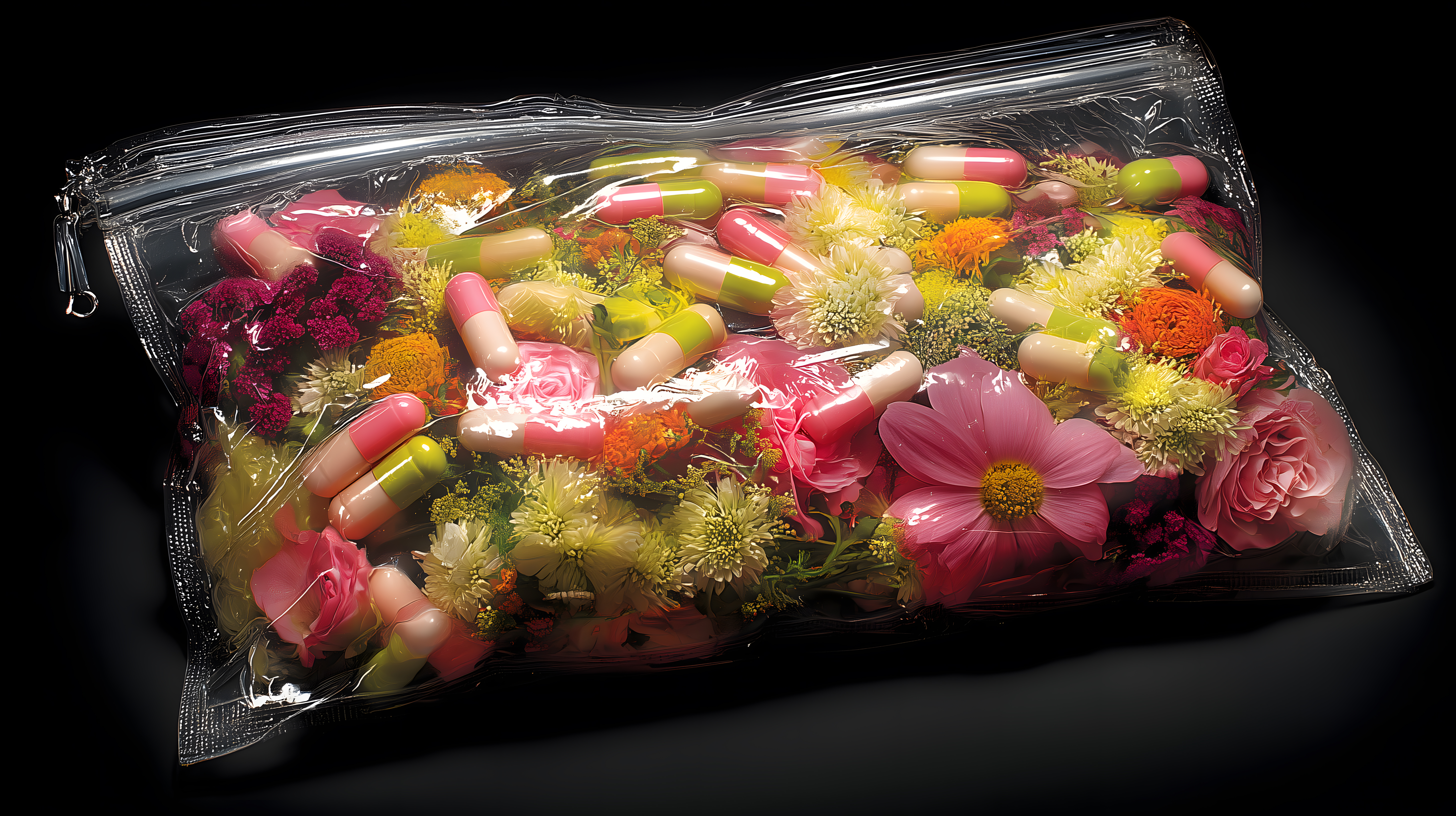 Dieses Stockfoto zeigt eine auffällige Komposition aus bunten Kapseln und Blumen in einer transparenten Vakuumverpackung vor schwarzem Hintergrund. Die Anordnung der Objekte schafft einen starken Kontrast zwischen den leuchtenden Farben der Blumen und Pillen und dem dunklen Hintergrund. Das Bild vermittelt einen medizinisch-pharmazeutischen Eindruck, kann aber auch für Themen wie Naturheilkunde, Kosmetik oder Wellness eingesetzt werden. Mit seiner hohen Auflösung und Creative-Commons-Lizenz eignet sich das Foto ideal als kostenloses Stockbild für Blogs, Newsletter, Social Media-Posts oder Werbematerialien.