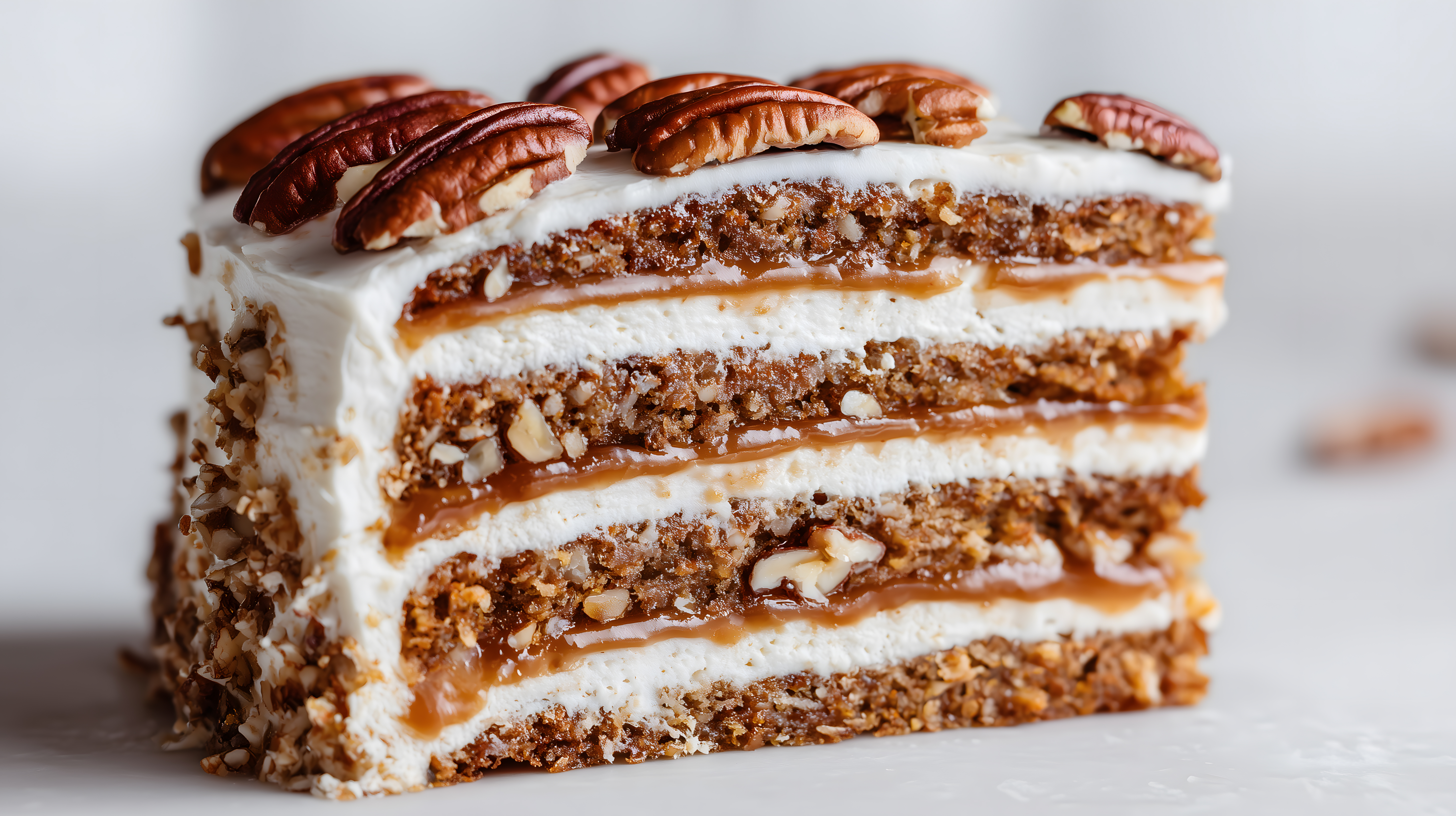 Das Bild zeigt eine üppige Scheibe einer Karamell-Nuss-Sahnetorte in hochauflösender Detailaufnahme. Saftige Schichten von süßem Karamell und knusprigen Pecannüssen sind zwischen zwei Schichten cremiger Sahne gestapelt und verleihen dem Kuchen eine opulente Optik. Das Arrangement der Tortenstücke im Hochformat und die scharfe Fokussierung auf die Textur und Fülle der Zutaten lenken den Blick auf die verlockende Sinnlichkeit des Desserts. Dieses hochwertige Stockfoto in hoher Auflösung eignet sich perfekt für die Verwendung in Blogbeiträgen, Newslettern oder Social-Media-Posts rund um Backen, Patisserie und Naschereien. Es steht unter einer Creative-Commons-Lizenz kostenfrei zur Verfügung.