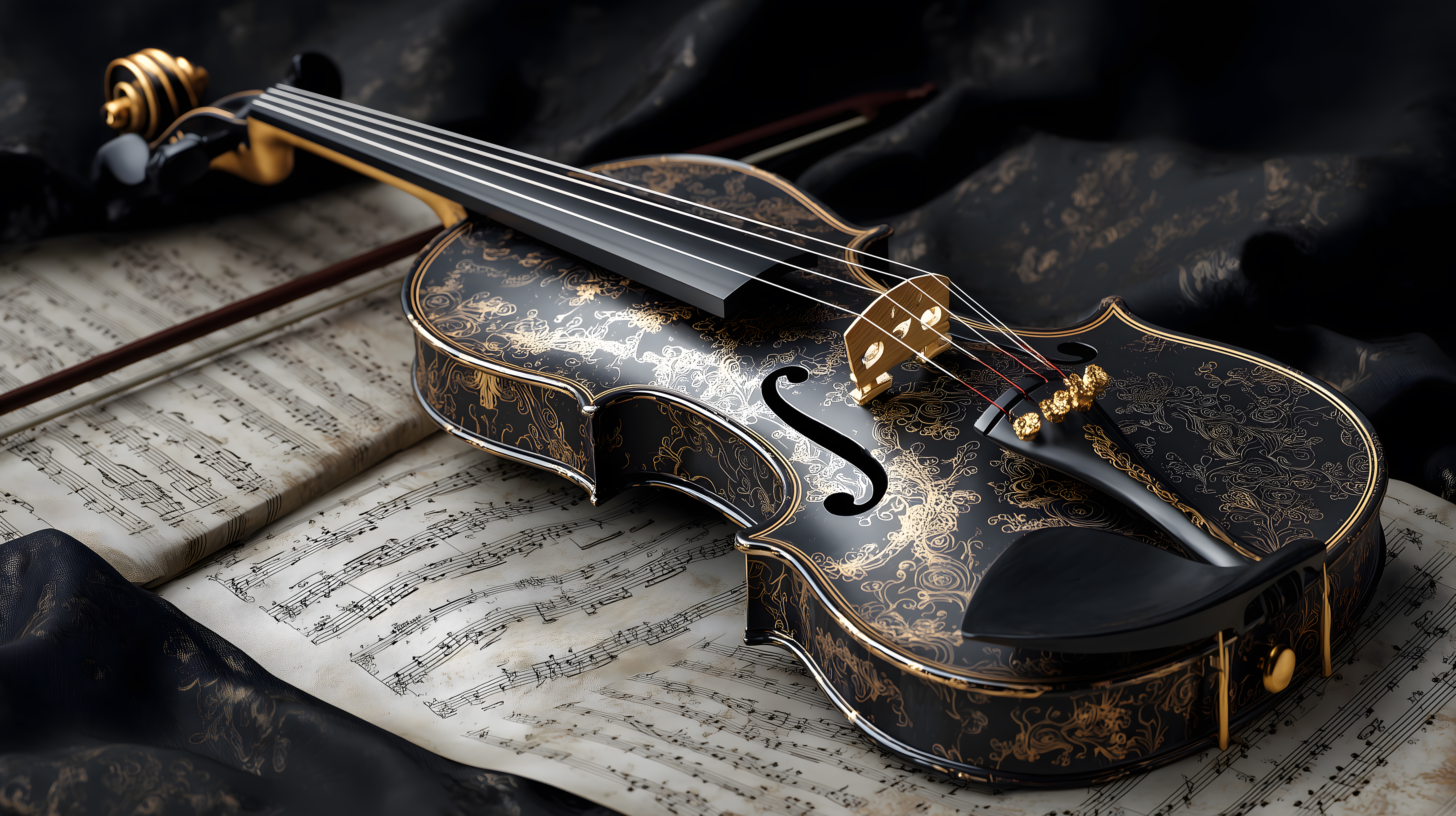Prachtvolle schwarze Violine mit goldenen Verzierungen auf Notenblättern von Marco Verch unter Creative Commons 2.0