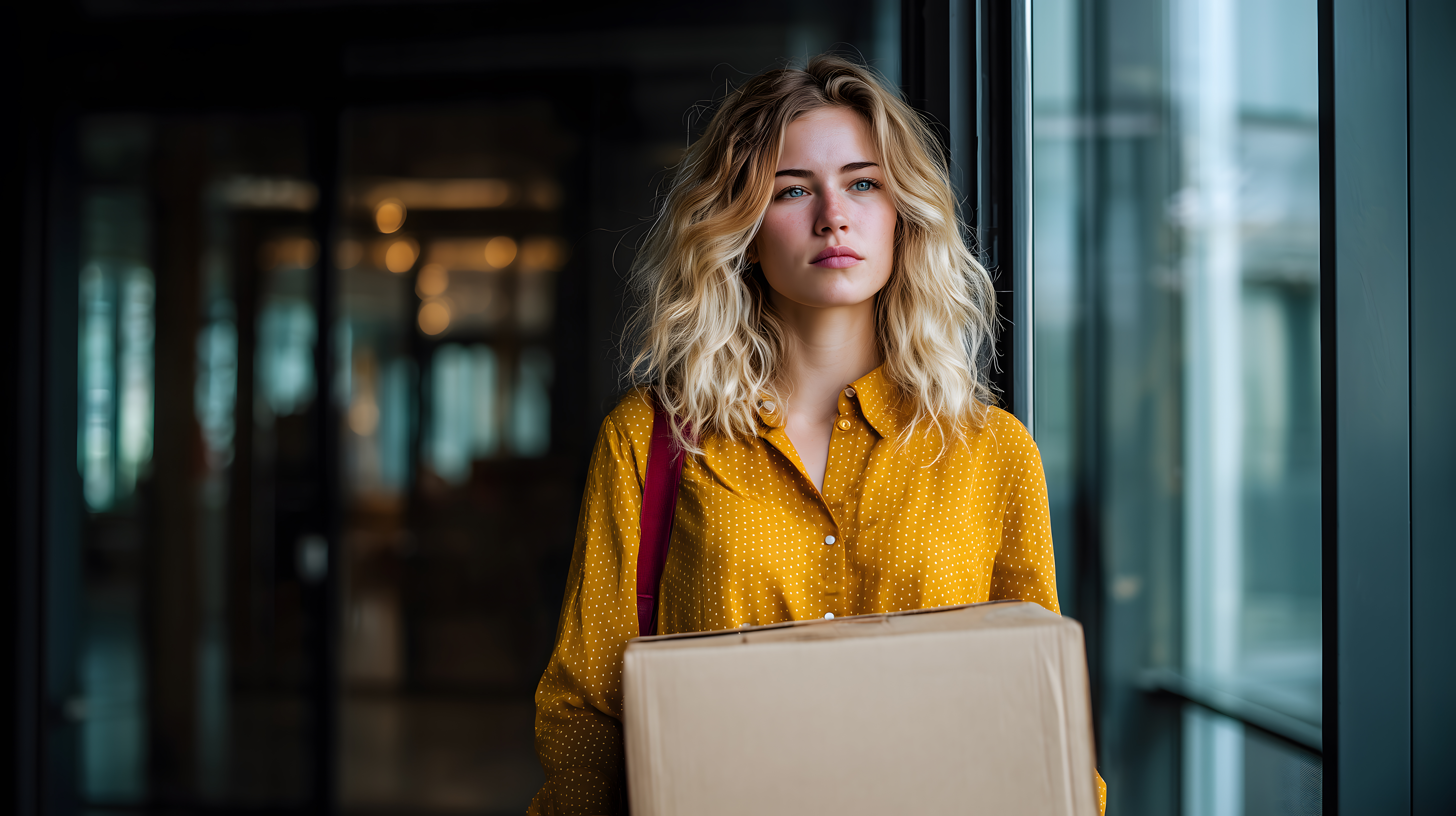 Das Bild zeigt eine junge Frau, die mit einem Umzugskarton in der Hand ein modernes Bürogebäude verlässt. Ihre ernste Miene und die Entschlossenheit in ihrer Körpersprache deuten darauf hin, dass sie sich auf eine Veränderung in ihrem Leben vorbereitet. Vielleicht hat sie ihren Arbeitsplatz gewechselt oder sich für eine neue Herausforderung entschieden. Das Bild vermittelt eine Stimmung des Abschieds und des Aufbruchs in eine ungewisse, aber vielversprechende Zukunft.