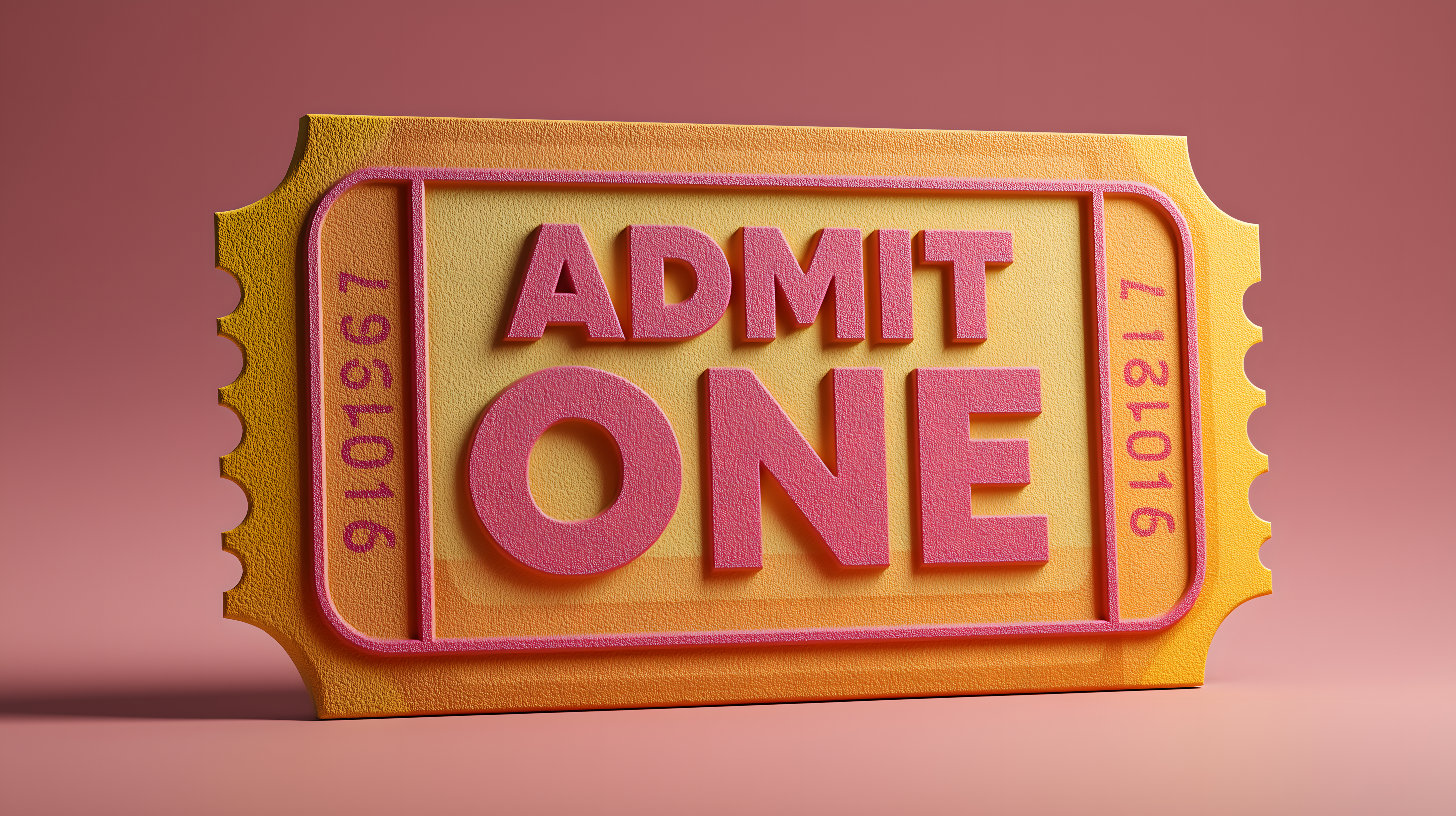 Diese detaillierte 3D-Illustration zeigt ein klassisches Kinoticket in einem auffallenden Pink und Gelb. Mit der großen, zentral platzierten Aufschrift 'ADMIT ONE' und den stilisierten Perforationslinien vermittelt das Bild einen nostalgischen, vintage-inspirierten Charakter. Die kräftigen Farben und die plastische Darstellung machen dieses Stockfoto zu einem einzigartigen, auffallenden Element für Werbung, Grafik-Design, Dekoration oder als Hintergrund in Blogs, Newslettern oder Social-Media-Beiträgen. Die hohe Auflösung und die Creative-Commons-Lizenzierung bieten viele Einsatzmöglichkeiten für dieses kostenlose Stockfoto.