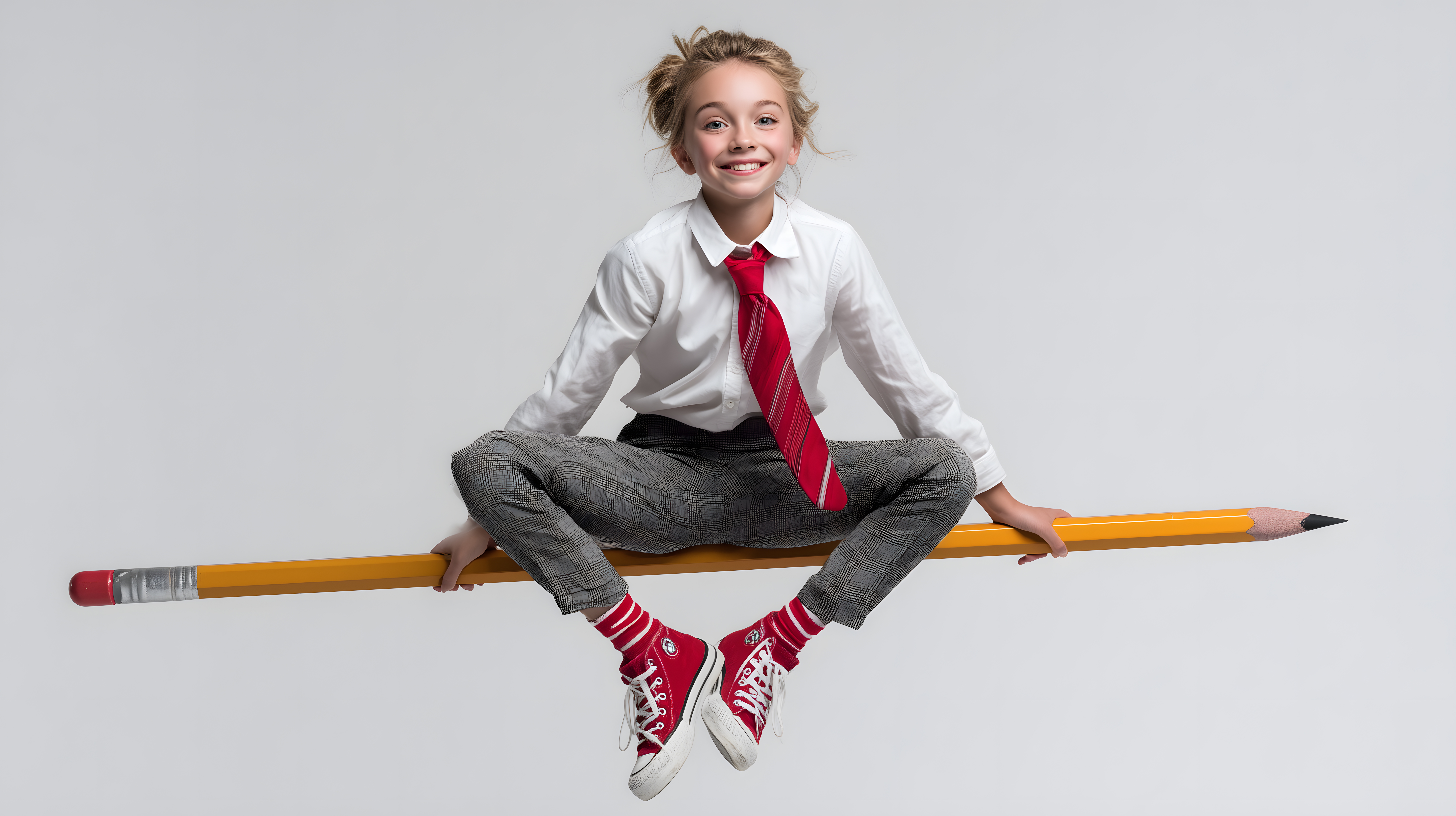 Dieses fröhliche Bild zeigt ein lächelndes Mädchen in Schuluniform, das auf einem riesigen Bleistift sitzt und dabei einen freudigen Ausdruck im Gesicht hat. Mit ihrer roten Krawatte und den roten Turnschuhen setzt sie farbige Akzente, die sich vom grau-weißen Hintergrund abheben. Das Foto vermittelt ein Gefühl von Kreativität, Optimismus und Freiheit. Es eignet sich hervorragend als kostenloses Stockfoto für den Einsatz in Blogs, Newslettern, Social-Media-Beiträgen oder Werbematerialien, die ein positives, verspieltes Thema transportieren sollen. Das Bild ist hochauflösend und unter einer Creative-Commons-Lizenz verfügbar.