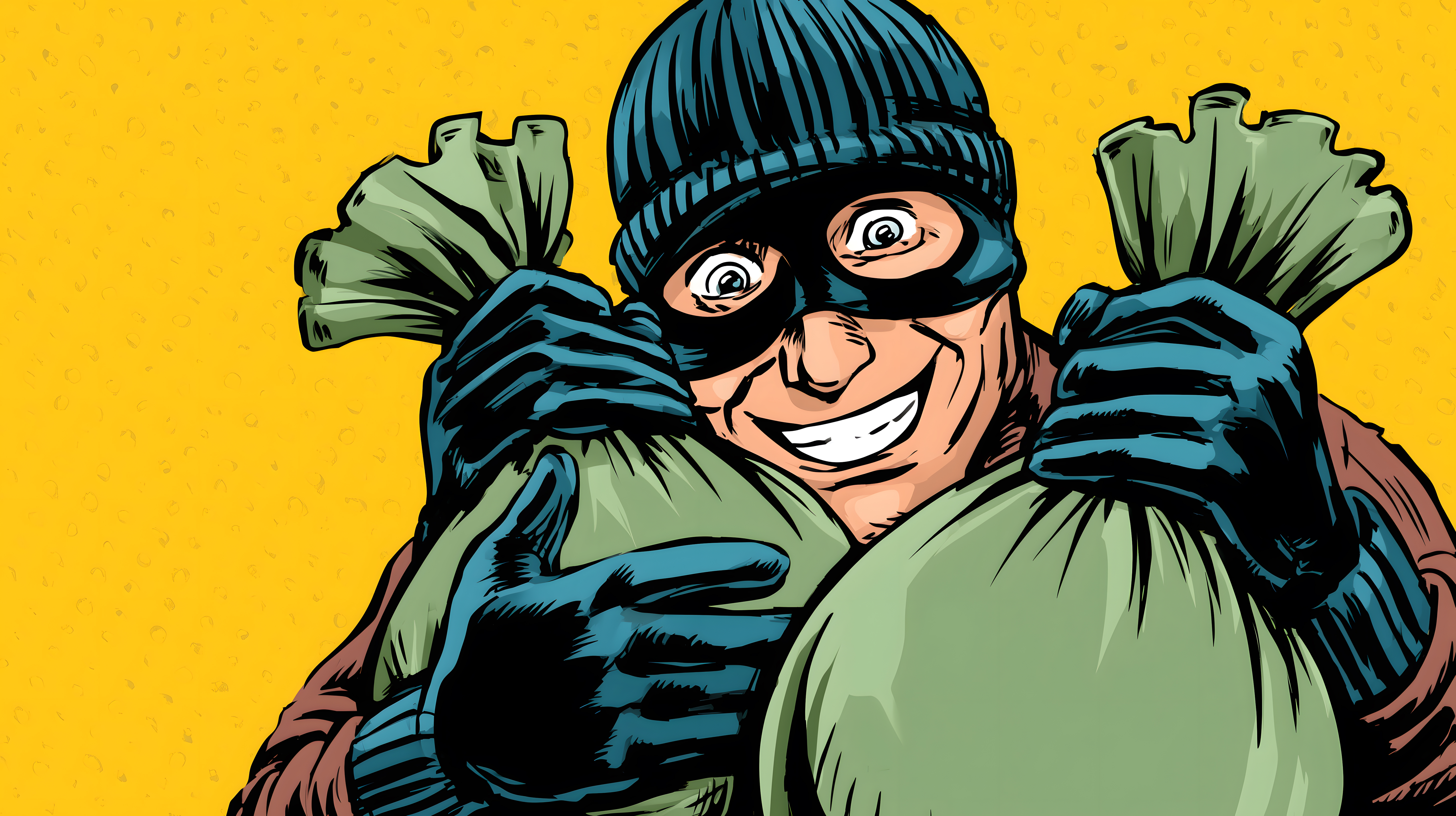 Das Bild zeigt einen Räuber oder Dieb, der mit einem breiten Grinsen und weit ausgebreiteten Armen vor einem leuchtend gelben Hintergrund steht. Er trägt eine schwarze Maske und hat große Geldsäcke in den Händen. Der Stil ist an Comic-Illustrationen und Pop-Art angelehnt, wodurch das Bild eine humorvolle und übertriebene Darstellung eines Bankraubs vermittelt. Das Motiv eignet sich hervorragend als kostenloses Stockfoto für Blogs, Newsletter, soziale Medien oder Werbung mit Themen rund um Kriminalität, Geld oder eine spielerisch-kreative Bildsprache.