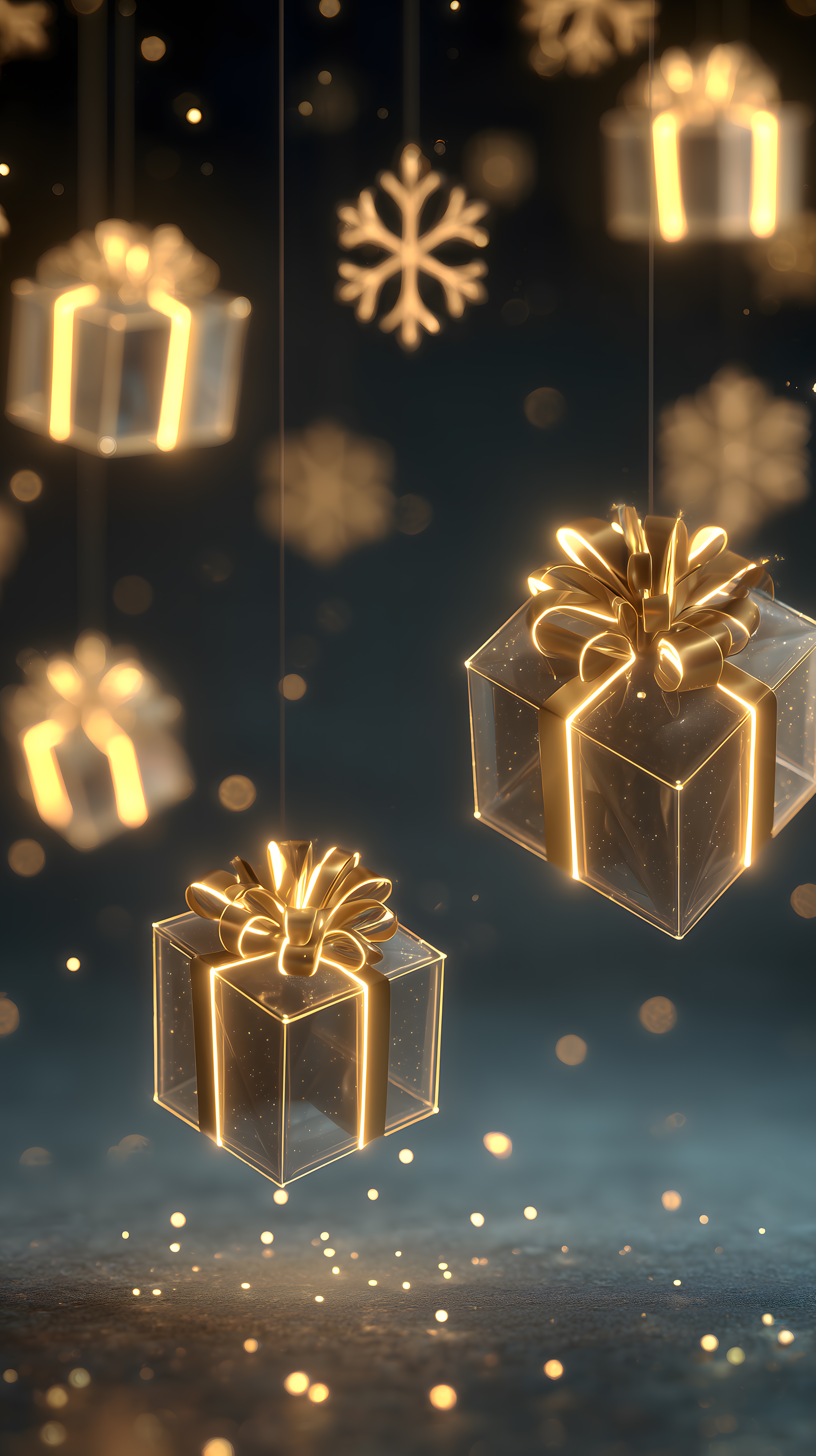 Dieses stimmungsvolle Bild zeigt schwebende, golden leuchtende Geschenkboxen vor einem dunklen Hintergrund mit Schneeflocken-Motiven. Die Geschenke scheinen leicht und elegant zu schweben, umgeben von einem Hauch von Glitzer und Lichtreflexen. Die warmen Goldtöne erzeugen eine festliche, feierliche Atmosphäre, die perfekt für Weihnachts- oder Winterkampagnen, Grußkarten oder Social-Media-Beiträge geeignet ist. Dieses hochauflösende Stockfoto ist kostenfrei und unter der Creative-Commons-Lizenz verwendbar.