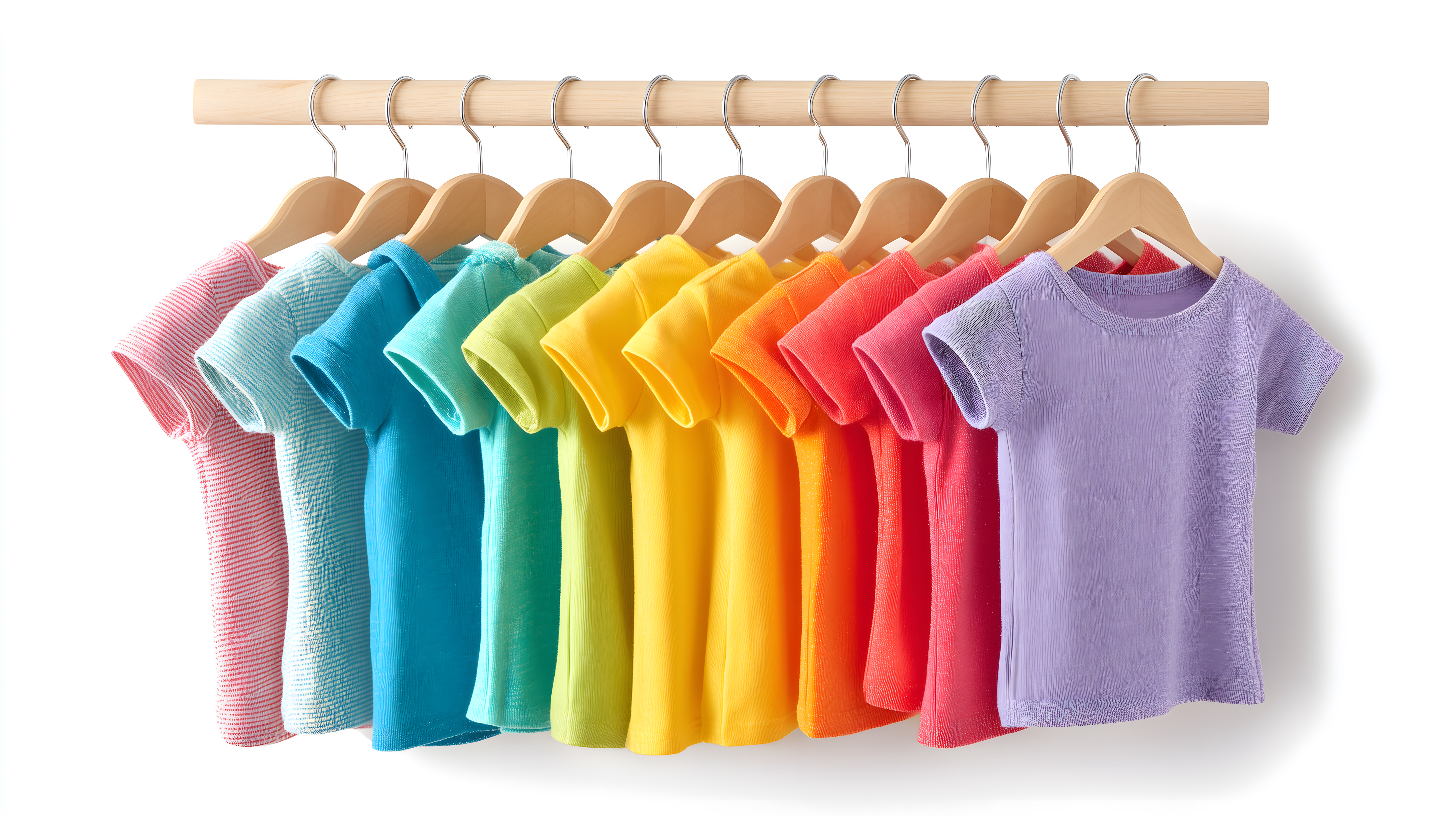 Dieses Foto zeigt eine Reihe bunter Kinderkleidungsstücke, die an einem Kleiderständer hängen. Die T-Shirts reichen von sanften Pastelltönen wie Mintgrün und Lavendel bis hin zu leuchtenden Farben wie Gelb, Orange und Rot. Die Anordnung der Kleidungsstücke auf den Holzbügeln verleiht dem Bild eine aufgeräumte, minimalistische Ästhetik, die ideal für die Präsentation von Produkten im Einzelhandel, in Werbeanzeigen oder als Hintergrundbild in Blogs und Social Media geeignet ist. Als kostenloses Stockfoto in hoher Auflösung und unter einer Creative-Commons-Lizenz ist dieses Bild vielseitig einsetzbar.