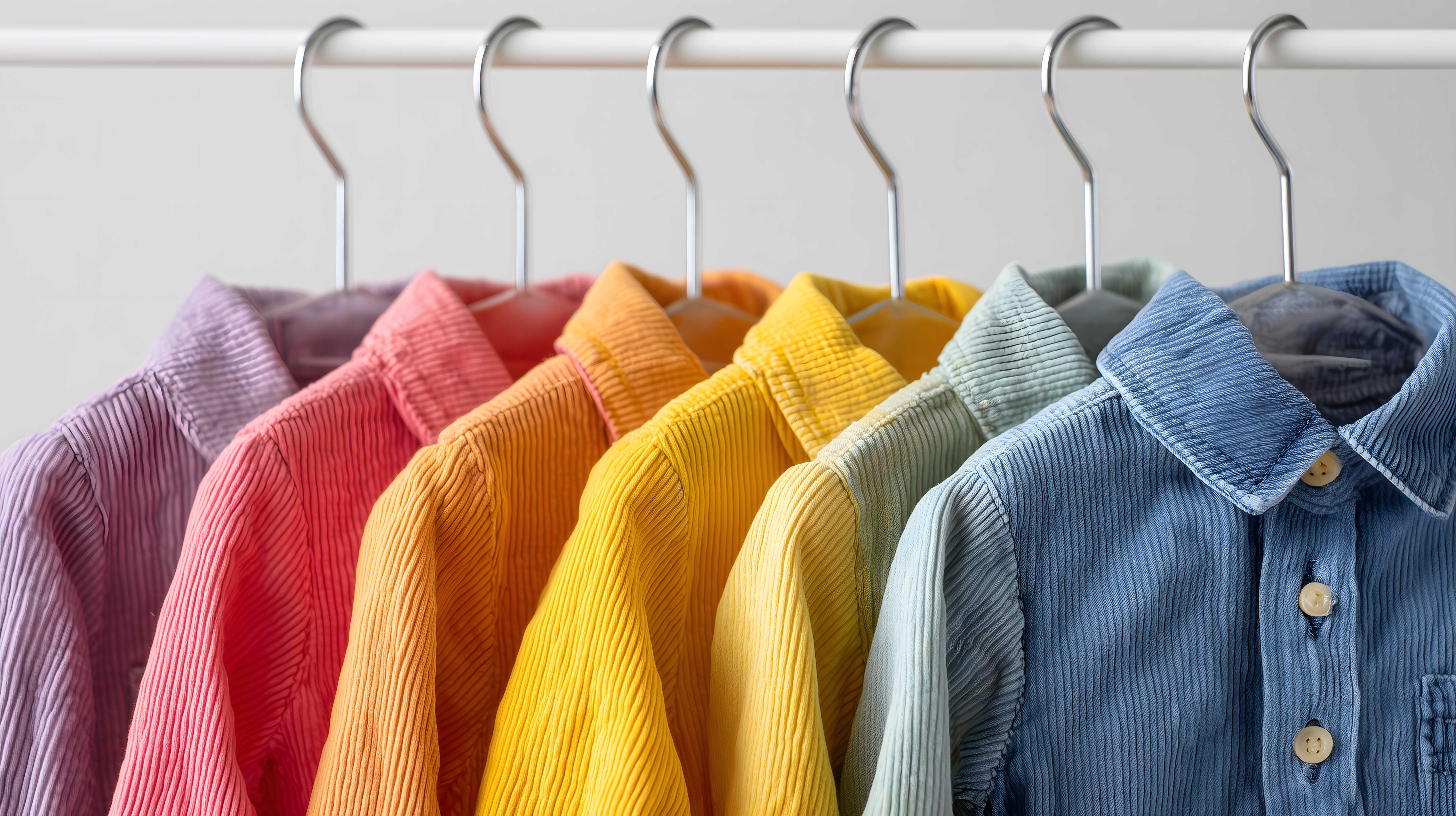 Dieses hochauflösende Stockfoto zeigt eine Reihe bunter Cord-Hemden in verschiedenen Pastellfarben, die an Kleiderbügeln aufgehängt sind. Die Hemden in Tönen von Violett, Rot, Orange, Gelb, Grün und Blau sind stilvoll arrangiert und bieten eine farbenfrohe, moderne Optik. Dieses Bild eignet sich hervorragend für den Einsatz in Blogbeiträgen, Werbekampagnen oder Social-Media-Posts rund um Kinderbekleidung, Mode-Trends oder kreative Produktpräsentationen. Das Foto ist in hoher Auflösung verfügbar und unter einer Creative-Commons-Lizenz frei verwendbar.