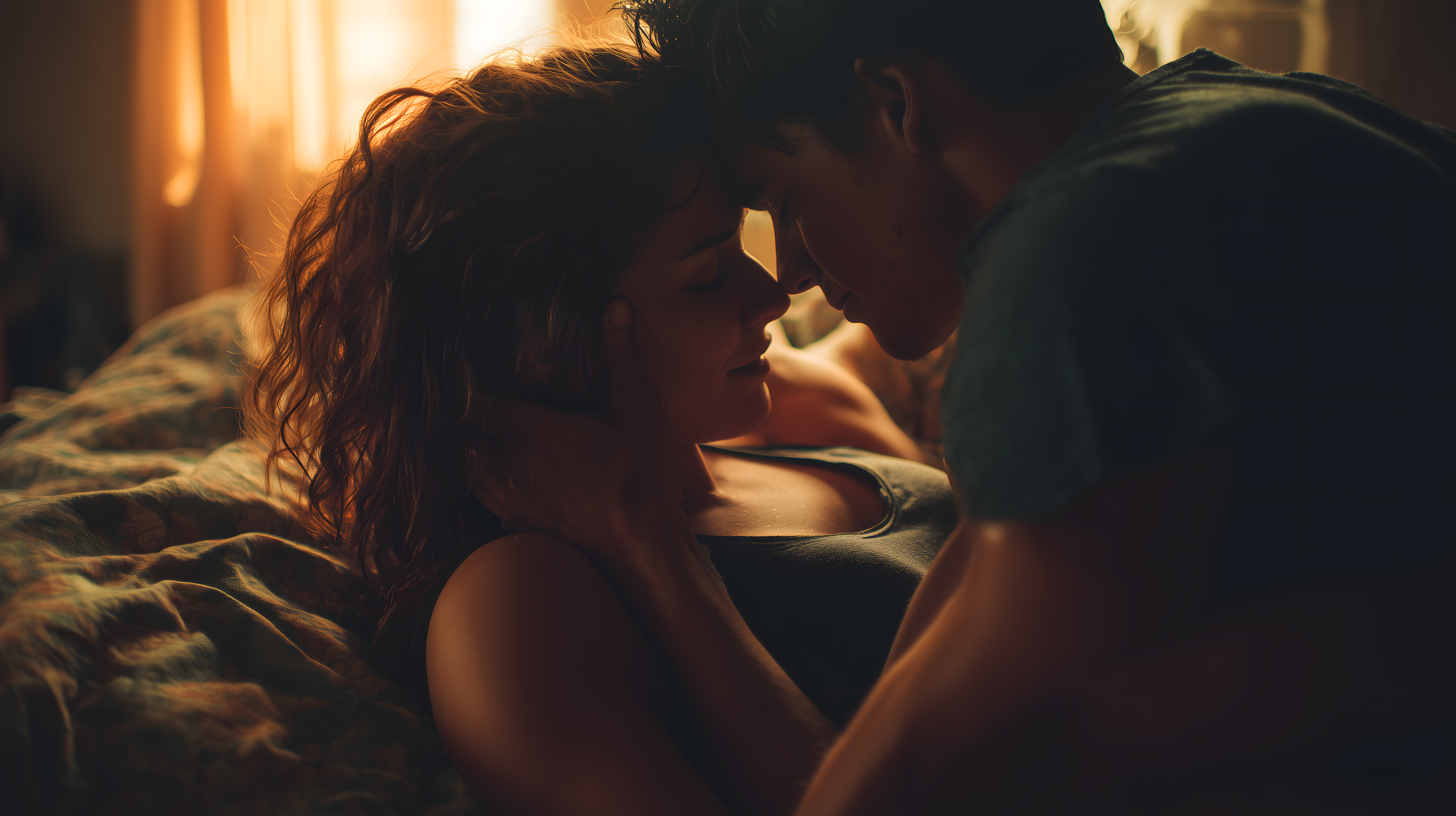 Das Bild zeigt ein Paar, das sich in inniger Umarmung hält und sich liebevoll ansieht. Die Lichtverhältnisse sind warm und stimmungsvoll, was eine romantische und sinnliche Atmosphäre schafft. Die Komposition konzentriert sich auf das Paar, wodurch die Emotionen und Intimität zwischen den beiden Personen in den Vordergrund rücken. Dieses Foto eignet sich hervorragend für den Einsatz in Blogs, Newslettern, Social-Media-Beiträgen oder Werbematerialien, die romantische, leidenschaftliche oder intime Themen behandeln. Das hochaufgelöste Stockfoto steht unter einer Creative-Commons-Lizenz zur freien Nutzung zur Verfügung.