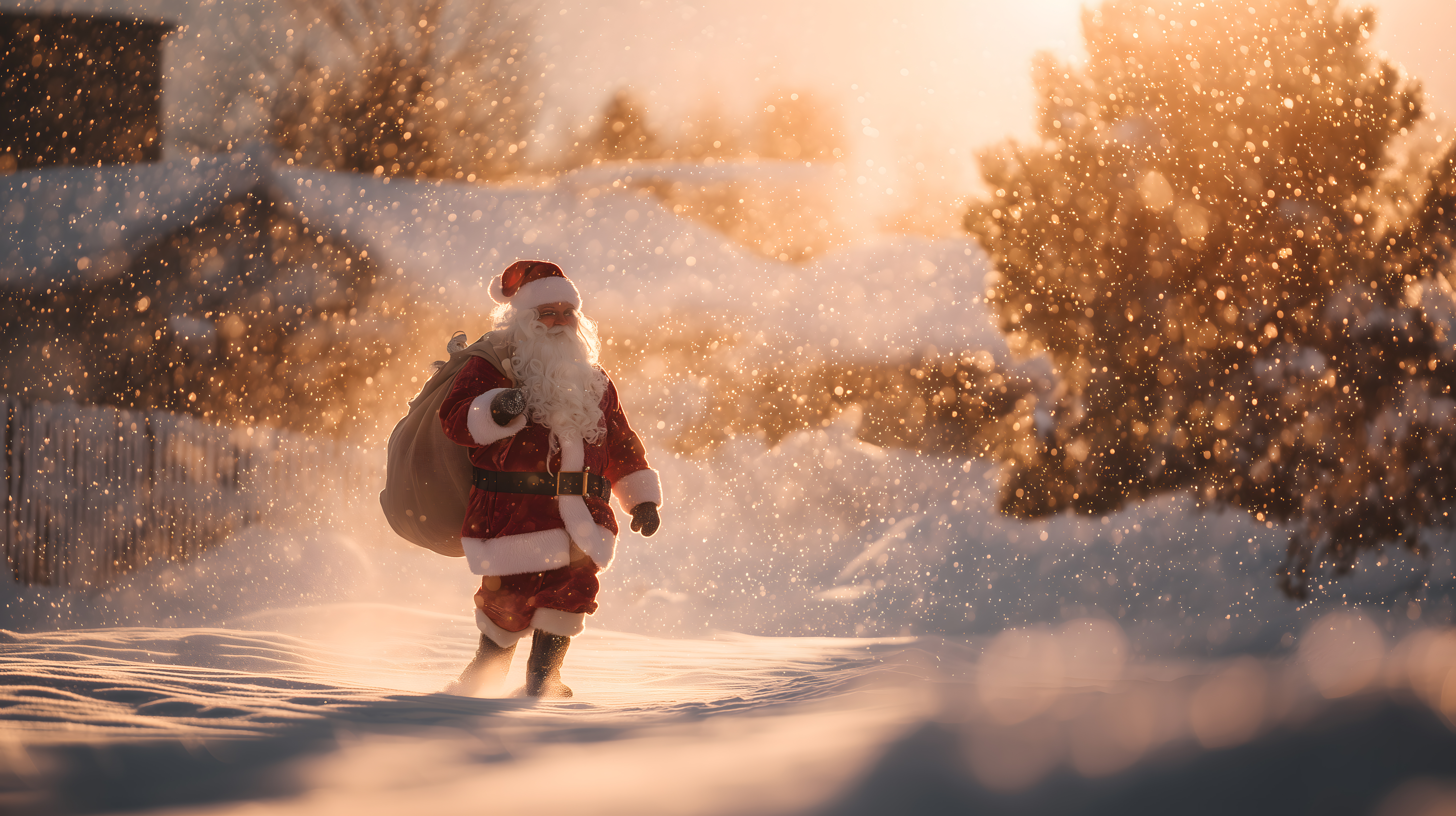 Das Bild zeigt den Weihnachtsmann, der mit seinem Geschenkesack in einer verschneiten Winterlandschaft durch einen Schneesturm läuft. Die Sonne geht gerade unter, was eine warme, goldene Beleuchtung und einen stimmungsvollen Kontrast zum fallenden Schnee erzeugt. Der Weihnachtsmann ist in traditioneller Kleidung gekleidet und macht sich auf den Weg, um seine Geschenke zu verteilen.