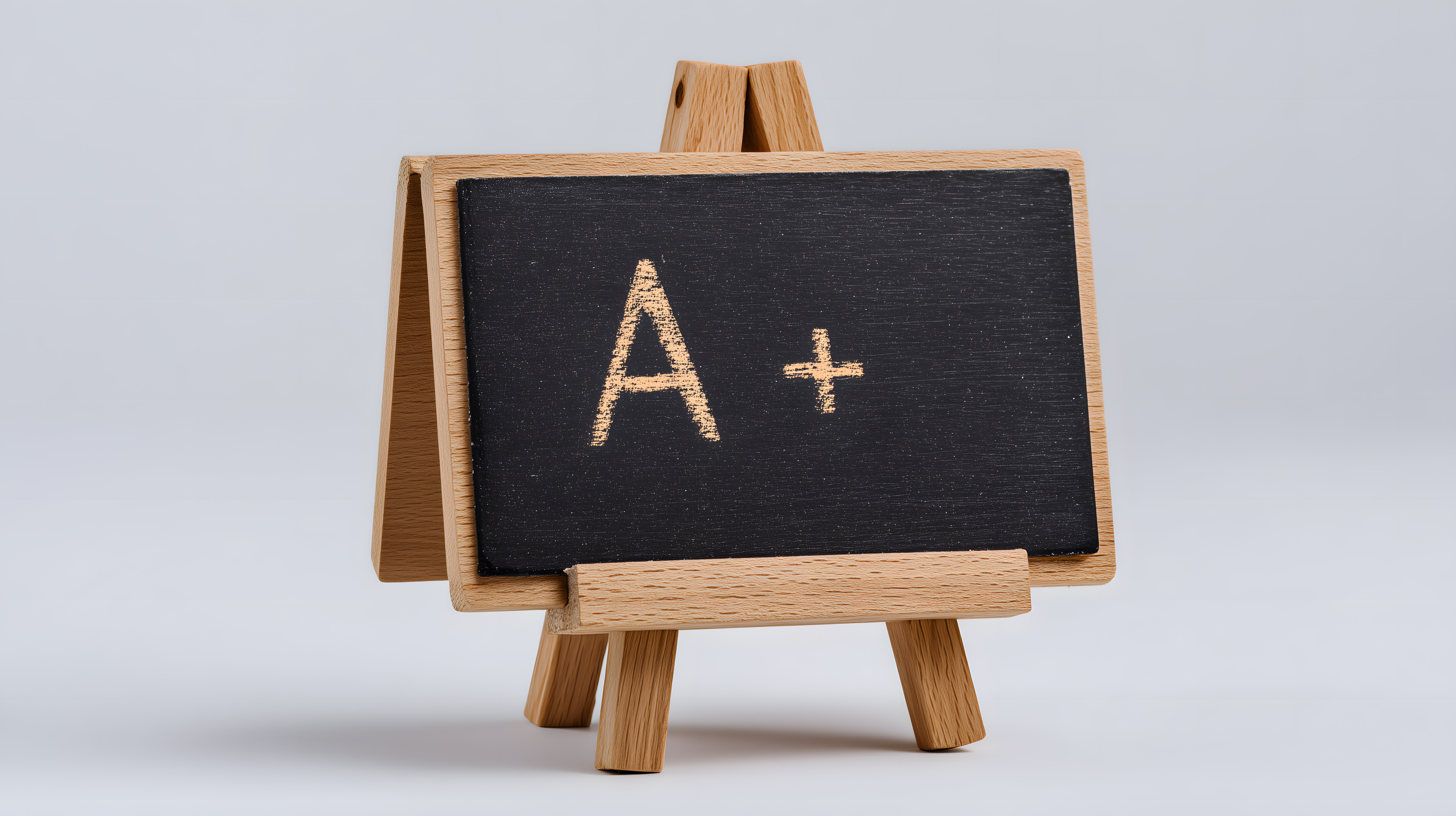 Dieses Foto zeigt eine kleine Tafel auf einer Staffelei, auf der die Note 'A+' in Kreideschrift geschrieben steht. Die Tafel hat einen schlichten, minimalistischen Stil und ist in den Farben Schwarz, Braun und Grau gehalten. Sie steht vor einem hellen Hintergrund und vermittelt ein Gefühl von Lernen, Bildung und Erfolg.