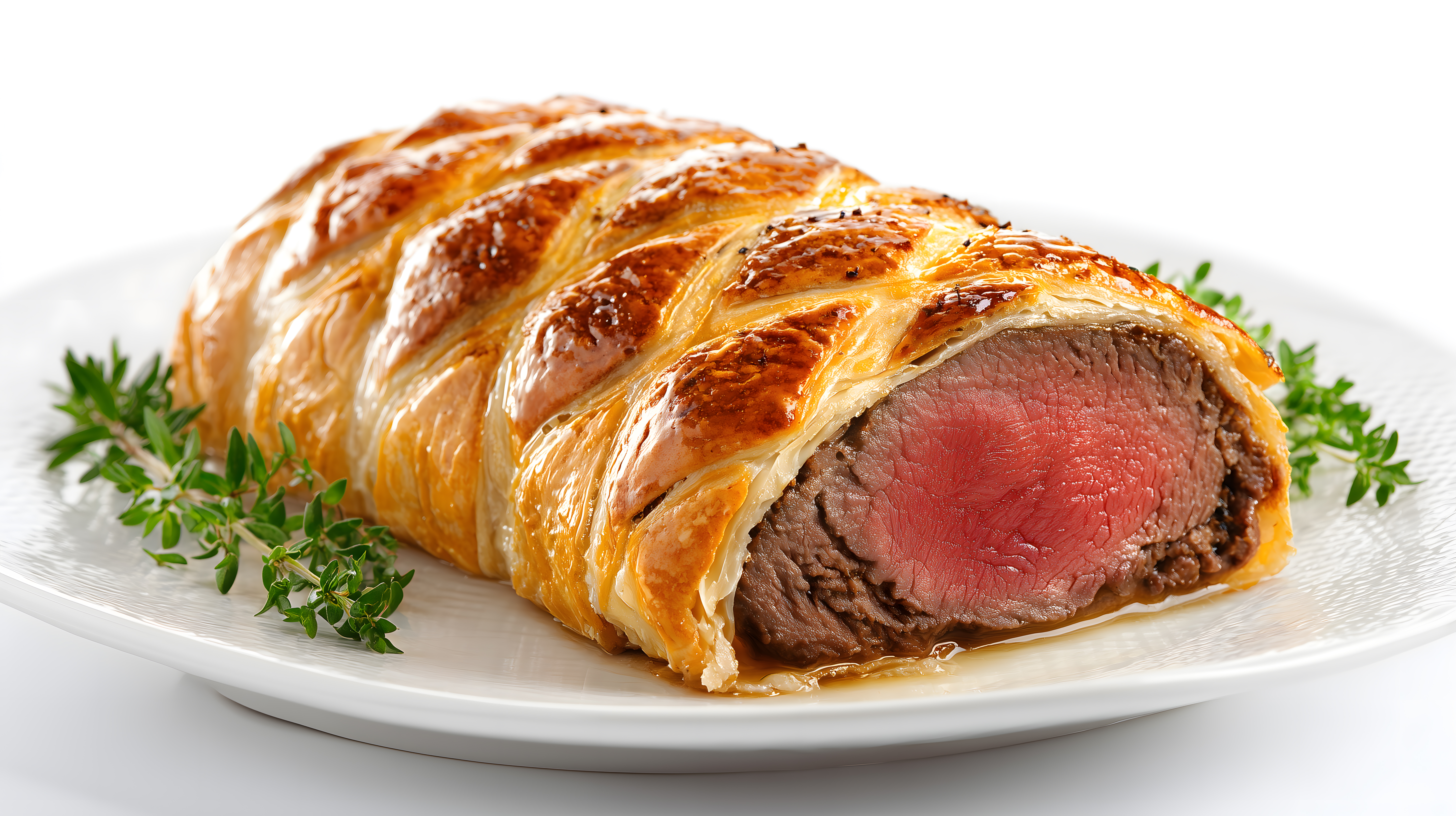 Das Bild zeigt ein köstliches Beef Wellington-Gericht, das auf einem weißen Teller angerichtet ist. Das Fleisch ist schön rosa gebraten und in eine goldbraune, fluffige Teighülle eingewickelt. Um das Fleisch herum sind frische Kräuter wie Rosmarin und Petersilie angeordnet, die dem Gericht eine appetitliche und elegante Optik verleihen.