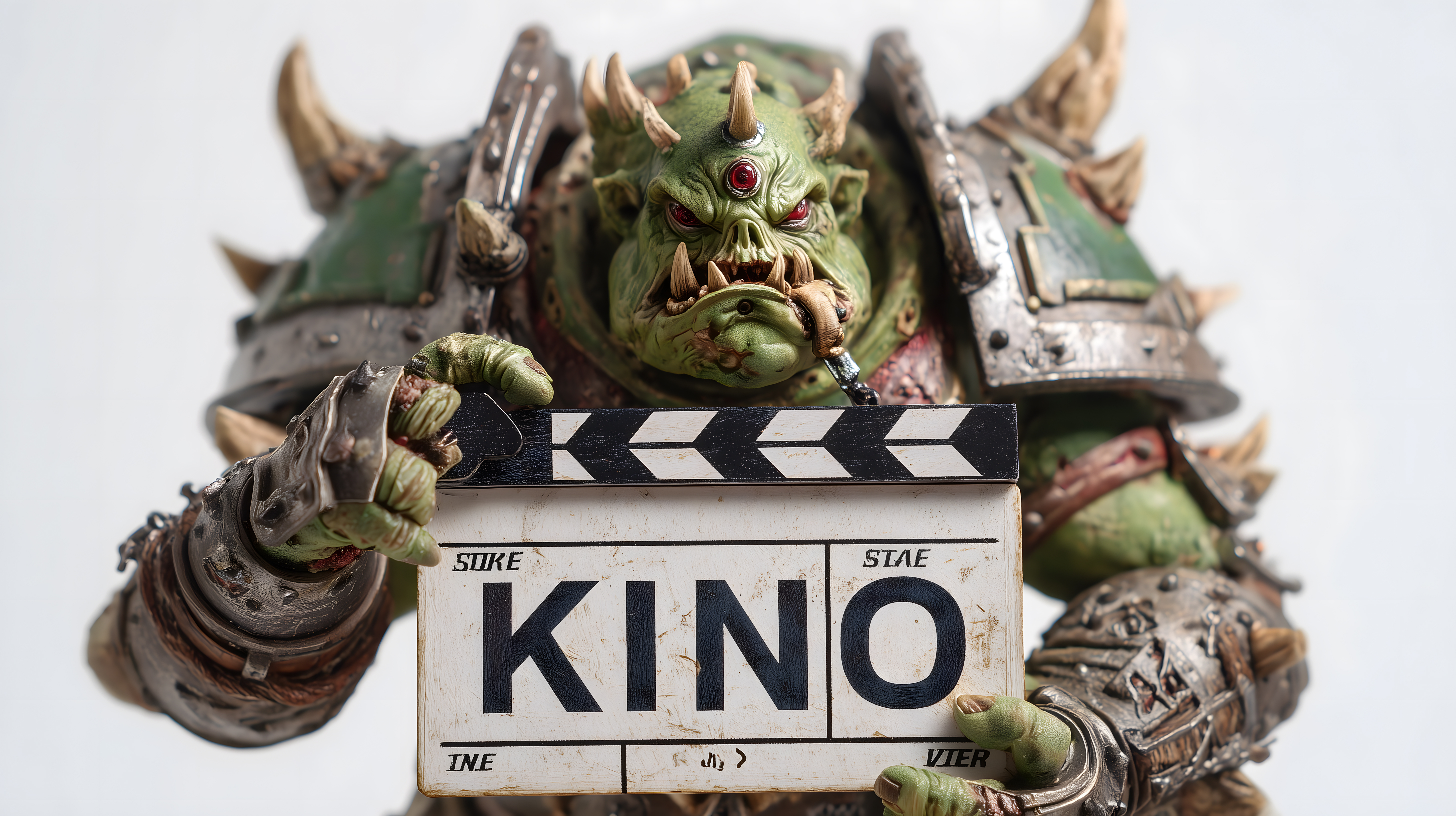 Das Foto zeigt einen grünen, monströsen Ork, der eine Filmklappe mit der Aufschrift 'KINO' in seinen Händen hält. Die Kreatur ist detailliert dargestellt, mit ausgeprägten Gesichtszügen, Hörnern und einer bedrohlichen Ausstrahlung. Das Motiv vermittelt eine Mischung aus Fantasy, Humor und Kinobezug, was es für eine Vielzahl von Anwendungen wie Blogs, Newsletter, Social Media-Posts oder Werbung interessant machen könnte. Als hochwertiges, kostenloses Stockfoto unter Creative-Commons-Lizenz ist es eine attraktive Option für Kreativschaffende auf der Suche nach einzigartigen, auffallenden Bildmotiven.