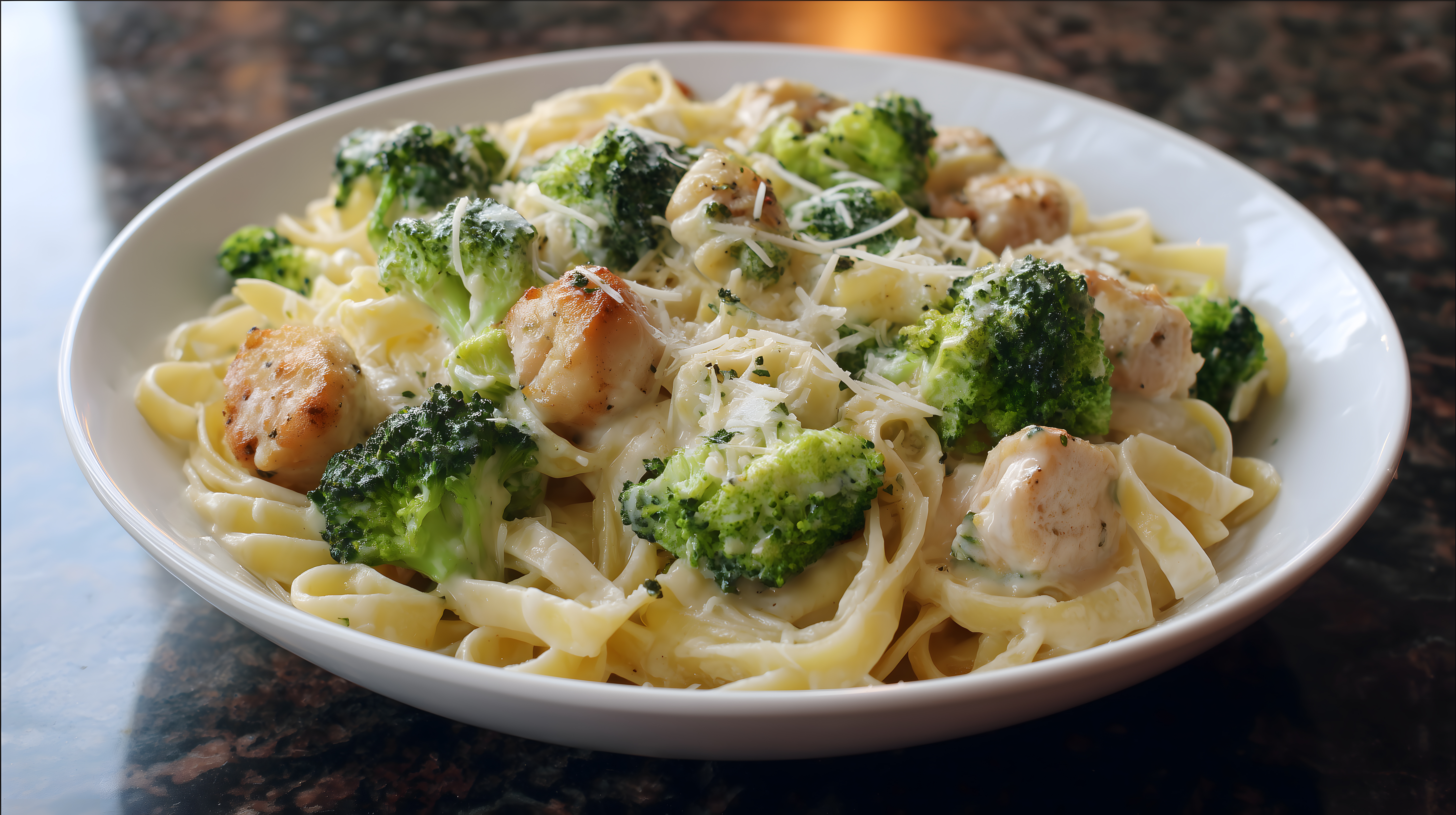 Das Bild zeigt einen köstlichen Nudelauflauf mit Hühnchen und Brokkoli in einer cremigen Sauce. Die Nudeln sind fettuccine, die mit Parmesan-Käse bestreut sind. Der Auflauf sieht sehr appetitlich und sättigend aus, ideal für ein leckeres Mittagessen oder Abendessen. Die Farbkombination von Grün, Gelb und Weiß ist sehr ausgewogen und einladend. Dieses Foto eignet sich hervorragend für Blogs, Newsletter, Social-Media-Posts und Werbematerialien rund um das Thema gesunde, köstliche Mahlzeiten. Als kostenloses Stockfoto in hoher Auflösung und mit Creative-Commons-Lizenz ist es vielseitig einsetzbar.