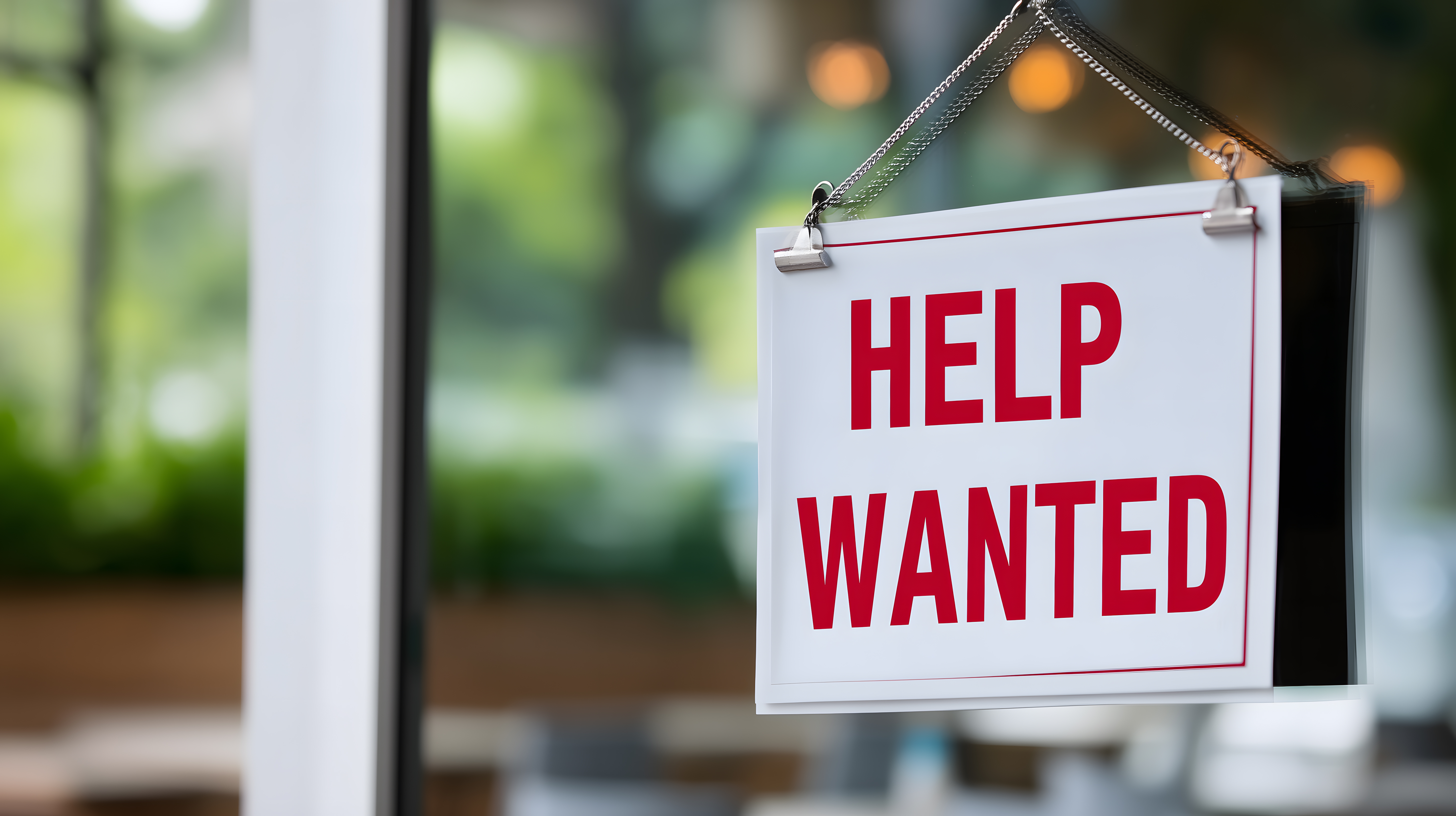 Dieses Foto zeigt ein Hinweisschild mit der Aufschrift 'HELP WANTED' in einem Geschäftsfenster. Das Schild ist in einem einfachen, minimalistischen Design gehalten und hängt an einer Kette vor einem unscharfen, grünlich-verschwommenen Hintergrund, der wahrscheinlich die Außenwelt oder Inneneinrichtung des Geschäfts zeigt. Das Bild vermittelt den Eindruck, dass das Unternehmen Mitarbeiter sucht und Unterstützung benötigt. Es eignet sich daher gut für Blogbeiträge, Newsletter oder Social-Media-Posts rund um Themen wie Arbeitssuche, Jobmöglichkeiten, Unternehmenskultur oder Personalmanagement. Als hochwertiges, kostenloses Stockfoto unter einer Creative-Commons-Lizenz ist es eine gute Wahl für visuelle Inhalte in verschiedenen Kontexten.