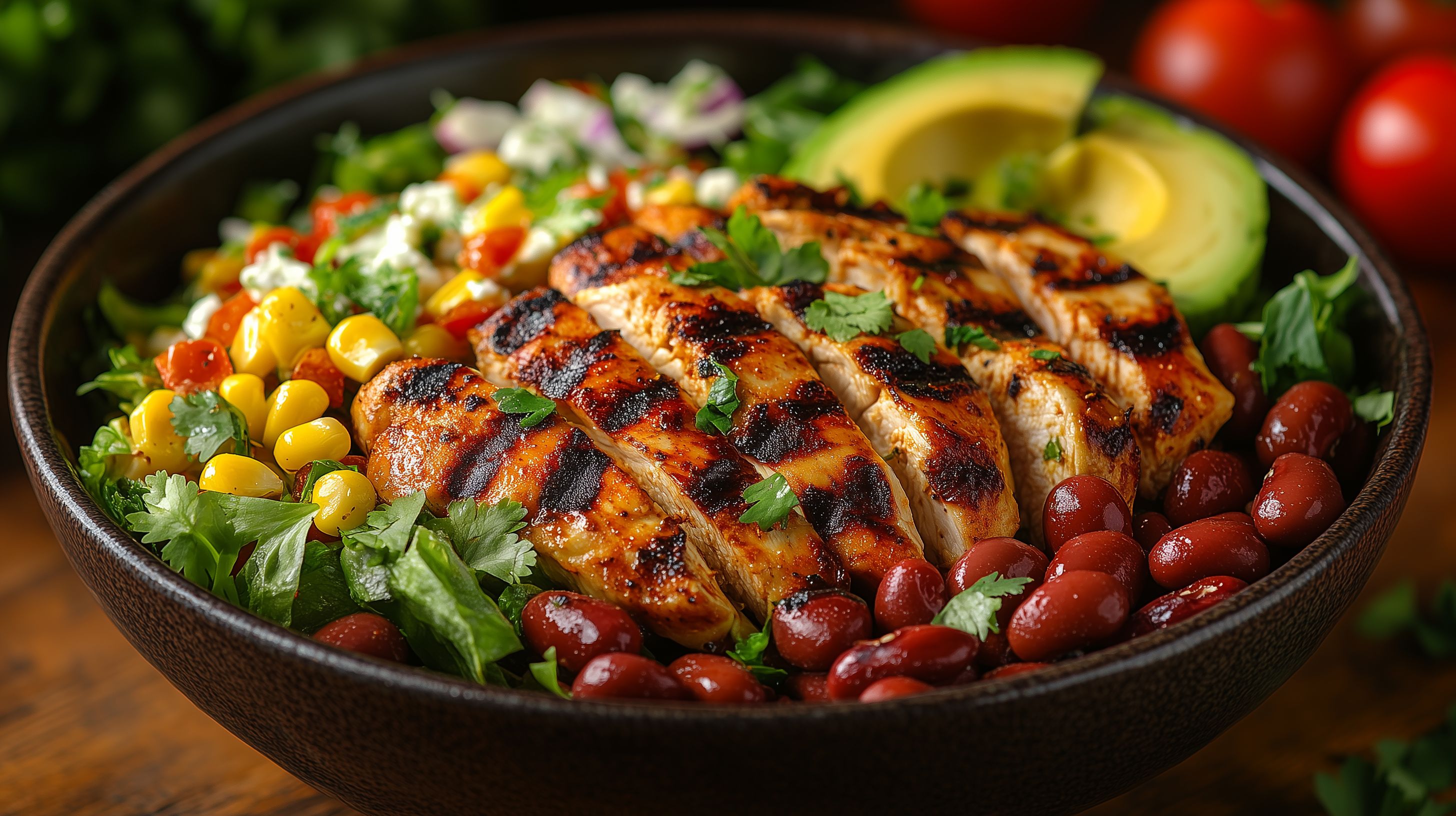 Dieses appetitliche Foto zeigt einen frischen, bunt zusammengestellten Salat mit gegrillten Hühnchenstücken, Avocado, Bohnen und Mais. Die Zutaten sind in einer rustikalen Schüssel auf einem Holztisch angerichtet. Der Salat besticht durch seine vielen verschiedenen Farben und Texturen - das macht ihn nicht nur lecker, sondern auch sehr ansprechend und fotogen. Das Foto eignet sich hervorragend als kostenloses Stockfoto für Blogs, Newsletter, Social-Media-Kanäle oder Werbematerialien rund um gesunde Ernährung, leckere Sommergerichte und mediterrane Küche. In hoher Auflösung verfügbar und unter Creative-Commons-Lizenz nutzbar.