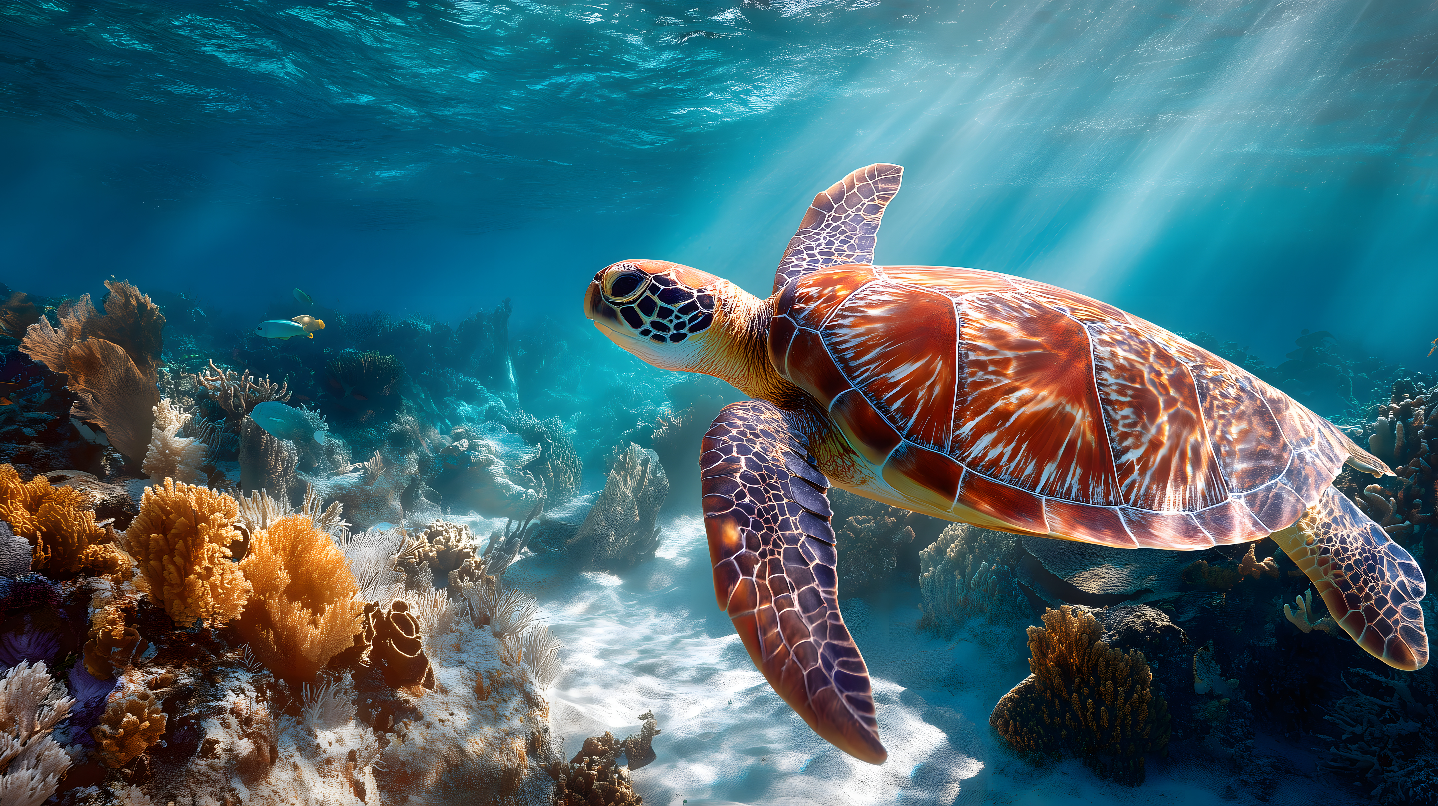 Dieses faszinierende Foto zeigt eine Meeresschildkröte, die elegant durch ein farbenfrohes Korallenriff im Ozean schwimmt. Die Schildkröte ist in ihren orangefarbenen und braunen Tönen ein beeindruckendes Motiv vor der türkisblauen Unterwasserwelt. Das Bild bietet eine atemberaubende Perspektive auf das Meeresökosystem und die vielfältige Lebewelt des Riffs. Diese hochauflösende Aufnahme eignet sich hervorragend als Hintergrund oder Eyecatcher für Blogs, Newsletter, Social-Media-Beiträge oder Werbematerialien. Als kostenloses Stockfoto unter der Creative-Commons-Lizenz kann es frei genutzt werden.