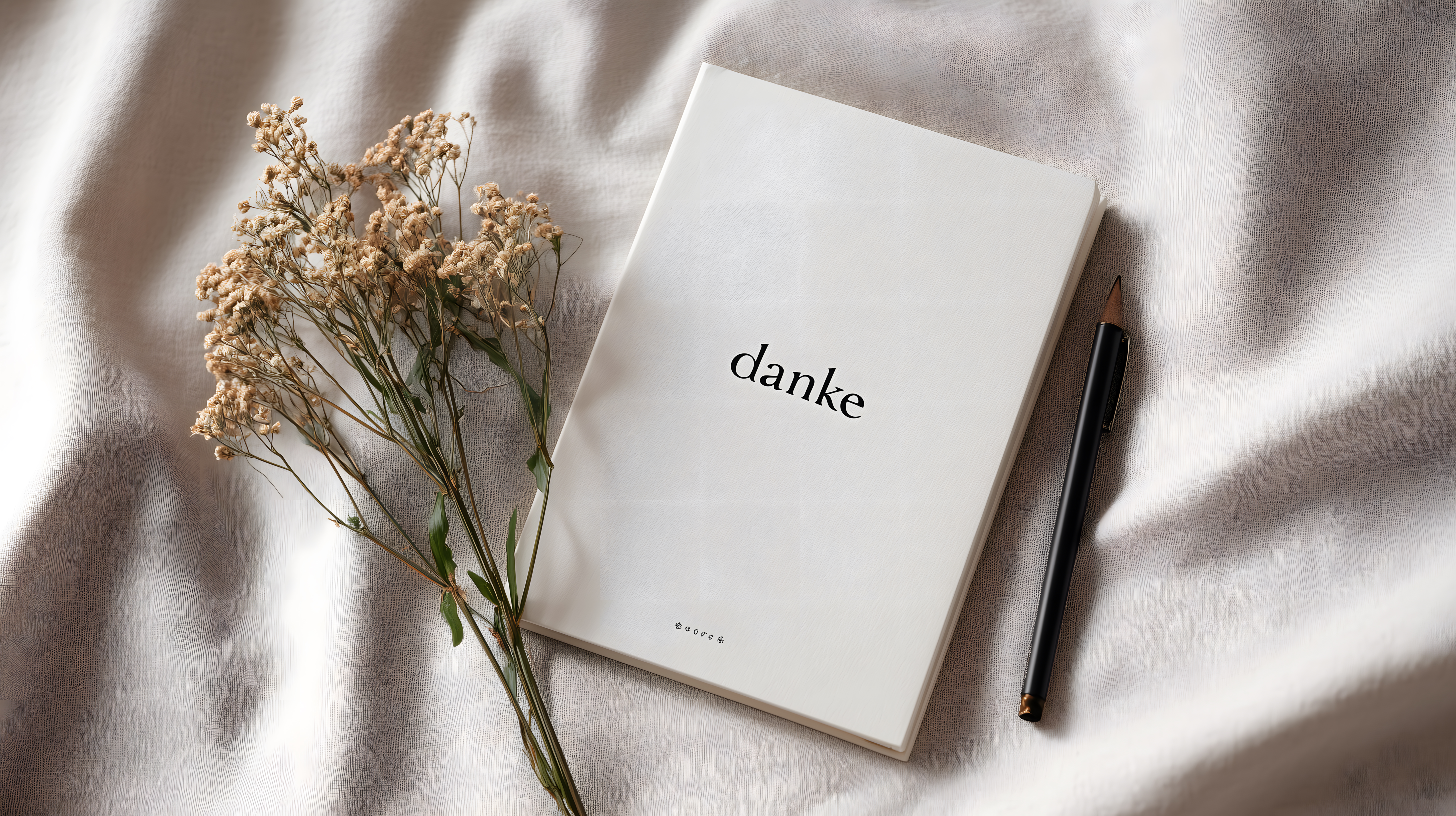 Dieses Foto zeigt ein weißes Notizbuch mit dem Schriftzug 'danke' auf einer beigen, stoffartigen Oberfläche. Das Bild wirkt ruhig und minimalistisch, mit viel Freiraum für Text oder Gestaltung. Es eignet sich hervorragend als kostenloses Stockfoto für verschiedenste Zwecke, wie Social-Media-Posts, Werbekampagnen, Blogbeiträge oder Newsletter. Das hochauflösende Bild steht unter der Creative-Commons-Lizenz zur freien Verwendung zur Verfügung.