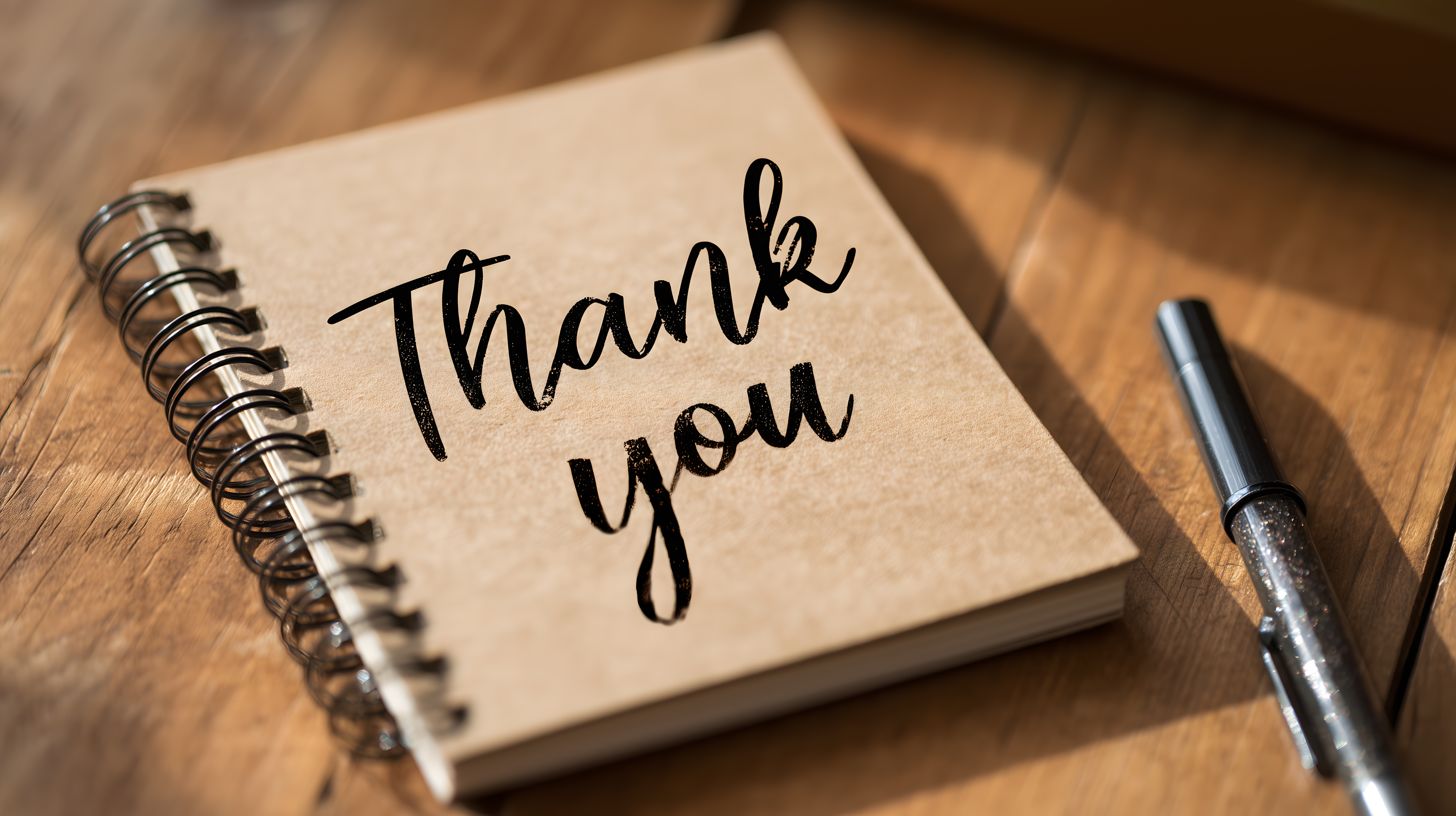 Dieses Foto zeigt einen handgeschriebenen Dankesgruß auf einem rustikalen, spiralgebundenen Notizbuch. Das Notizbuch liegt auf einem hölzernen Tisch mit sichtbarer Maserung, was dem Bild einen authentischen, traditionellen Charakter verleiht. Der schwarze Text auf braunem Papier hebt sich kontrastreich ab und verleiht der Szene eine schlichte, aber elegante Ästhetik.