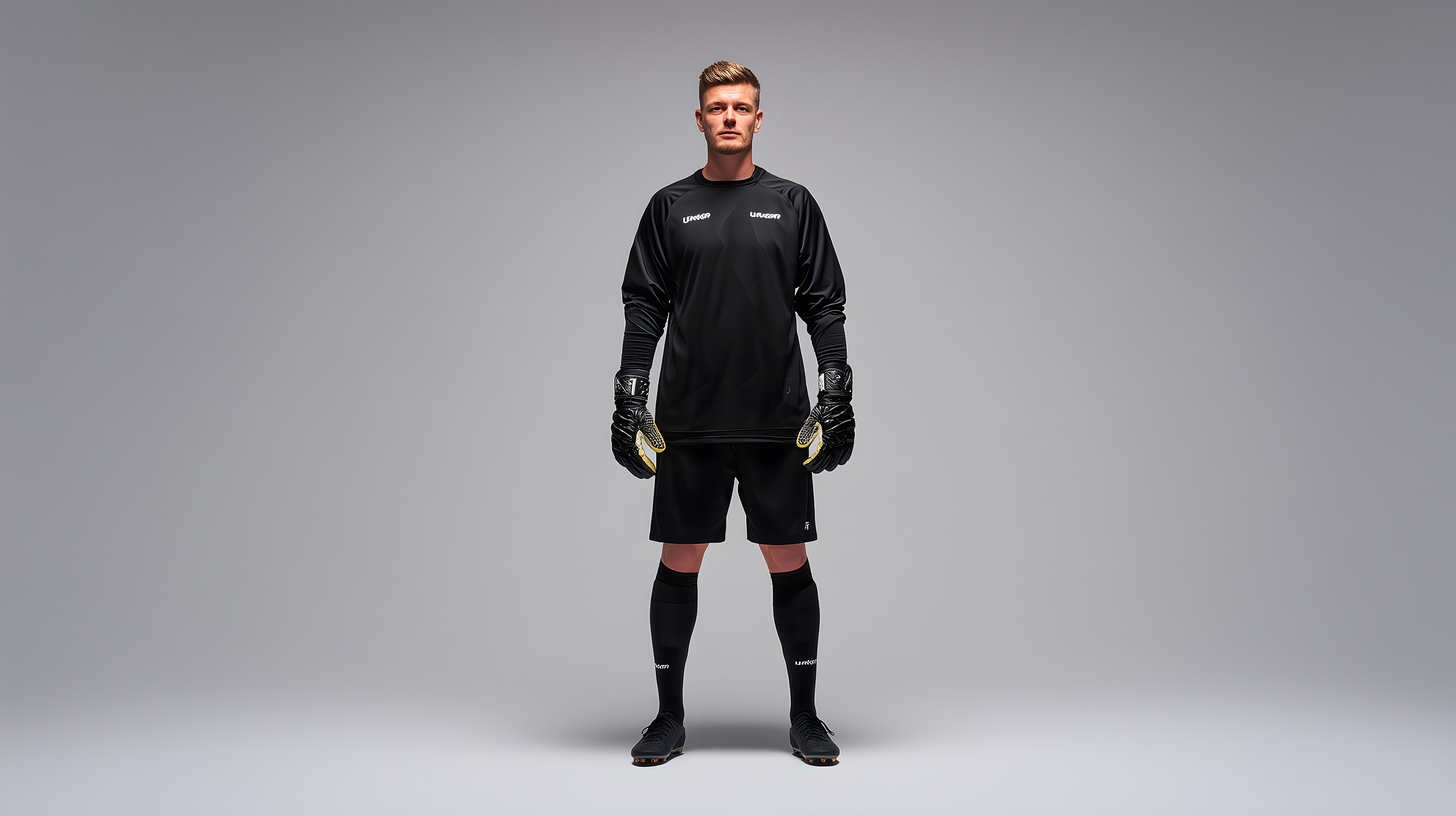 Dieses Stockfoto zeigt einen Fußballtorhüter in voller Montur, der sich in einer Studioaufnahme auf neutralem grauem Hintergrund präsentiert. Der Sportler trägt ein schwarzes Trikot mit Vereinslogo sowie schwarze Shorts und Torwarthandschuhe, was seine Rolle als Torwart deutlich macht. Mit seinem entschlossenen Blick und der aufrechten Haltung vermittelt er Stärke und Professionalität. Dieses hochauflösende Bild eignet sich hervorragend für den Einsatz in Sportberichten, Fußballportalen, Werbematerialien oder Social-Media-Kanälen rund um den Fußballsport. Als kostenloses Stockfoto unter einer Creative-Commons-Lizenz lässt es sich flexibel und rechtssicher in verschiedenen Kontexten nutzen.