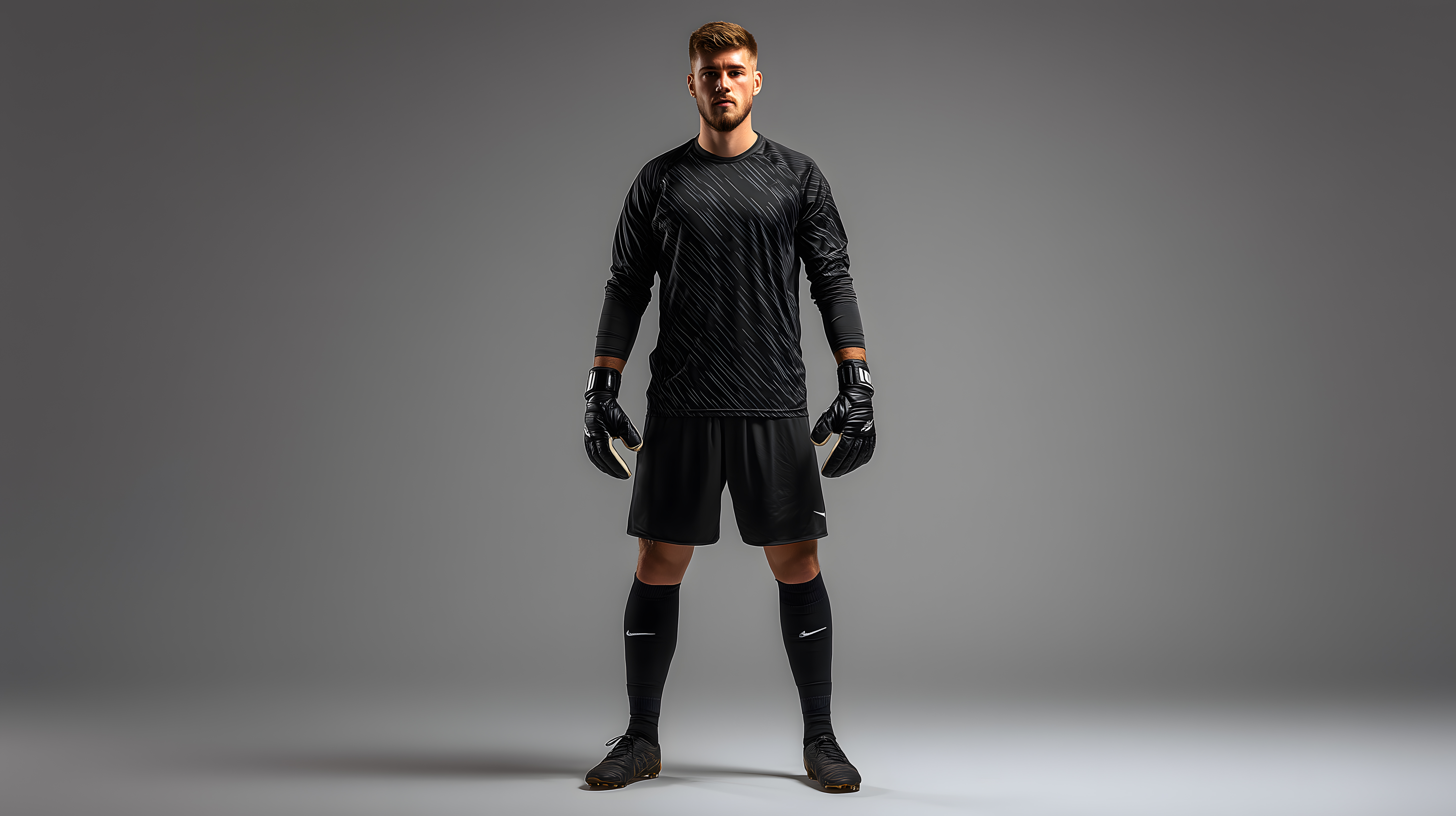Das Foto zeigt einen Fußballtorhüter in seiner schwarzen Spieluniform. Er steht aufrecht und trägt die typischen Torwarthandschuhe. Der Hintergrund ist einfarbig dunkel, was den Fokus ganz auf den Athleten lenkt. Dieses Stockfoto eignet sich hervorragend für den Einsatz in Blogbeiträgen, Newsletter-Grafiken oder Social-Media-Posts rund um Themen wie Profifußball, Sportbekleidung oder Torwarttraining. Es ist in hoher Auflösung und unter einer Creative-Commons-Lizenz verfügbar, sodass es kostenfrei genutzt werden kann.