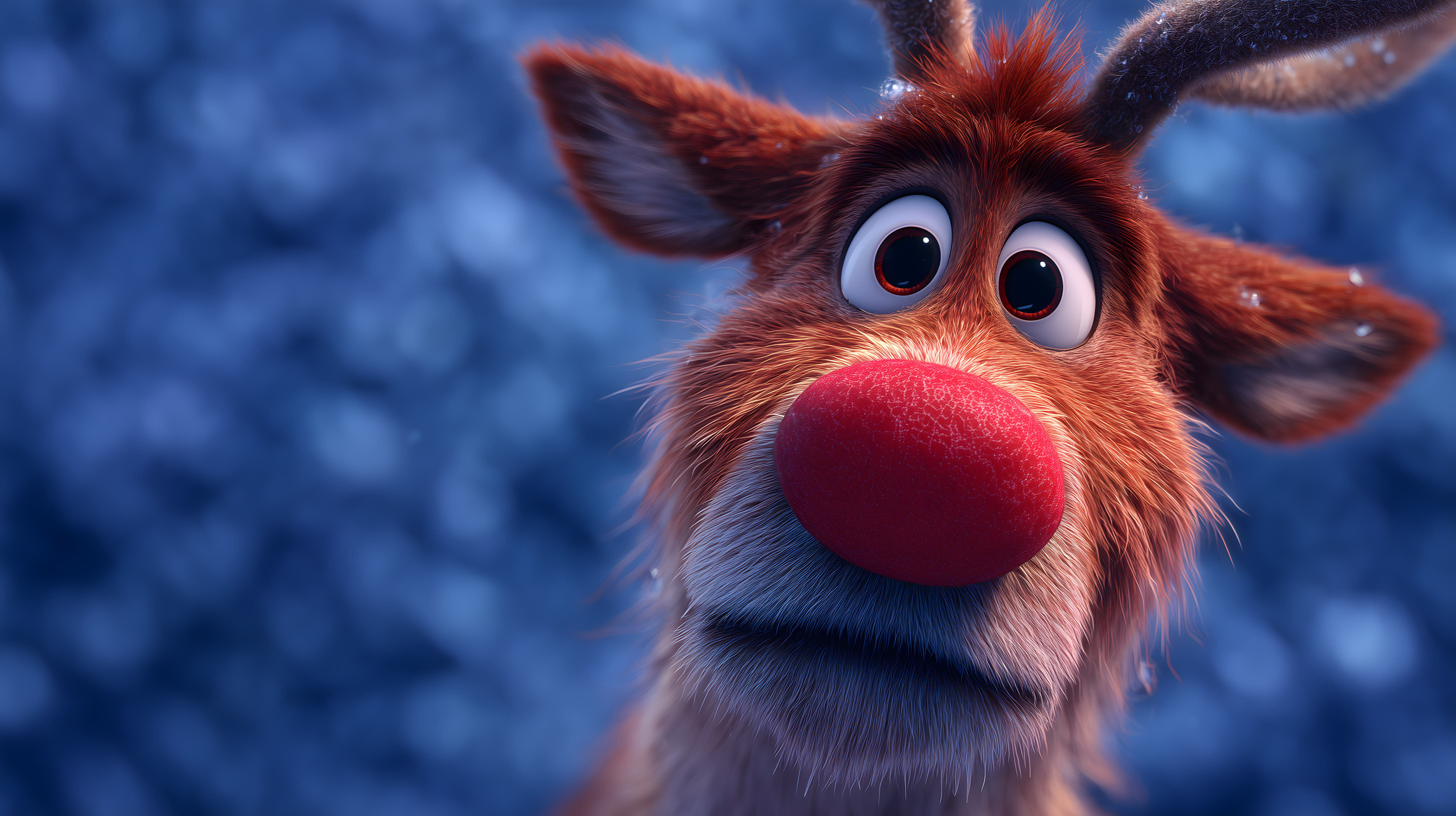 Das Bild zeigt ein entzückendes Rentier mit großen, auffallend roten Augen und einer auffällig roten, herzförmigen Nase. Mit seinem zottigen, rotbraunen Fell und den spitzen Ohren wirkt das Rentier wie eine liebevolle Cartoon-Figur. Die Darstellung ist detailreich und lebhaft, was den Eindruck eines computeranimierten Charakters aus einem Weihnachtsfilm verstärkt. Dieses fröhliche Tiermotiv eignet sich hervorragend als Stockfoto für Weihnachts- und Winterthemen in Blogs, Newslettern oder Social-Media-Beiträgen. Das kostenlose Bild in hoher Auflösung steht unter einer Creative-Commons-Lizenz zur Verfügung.