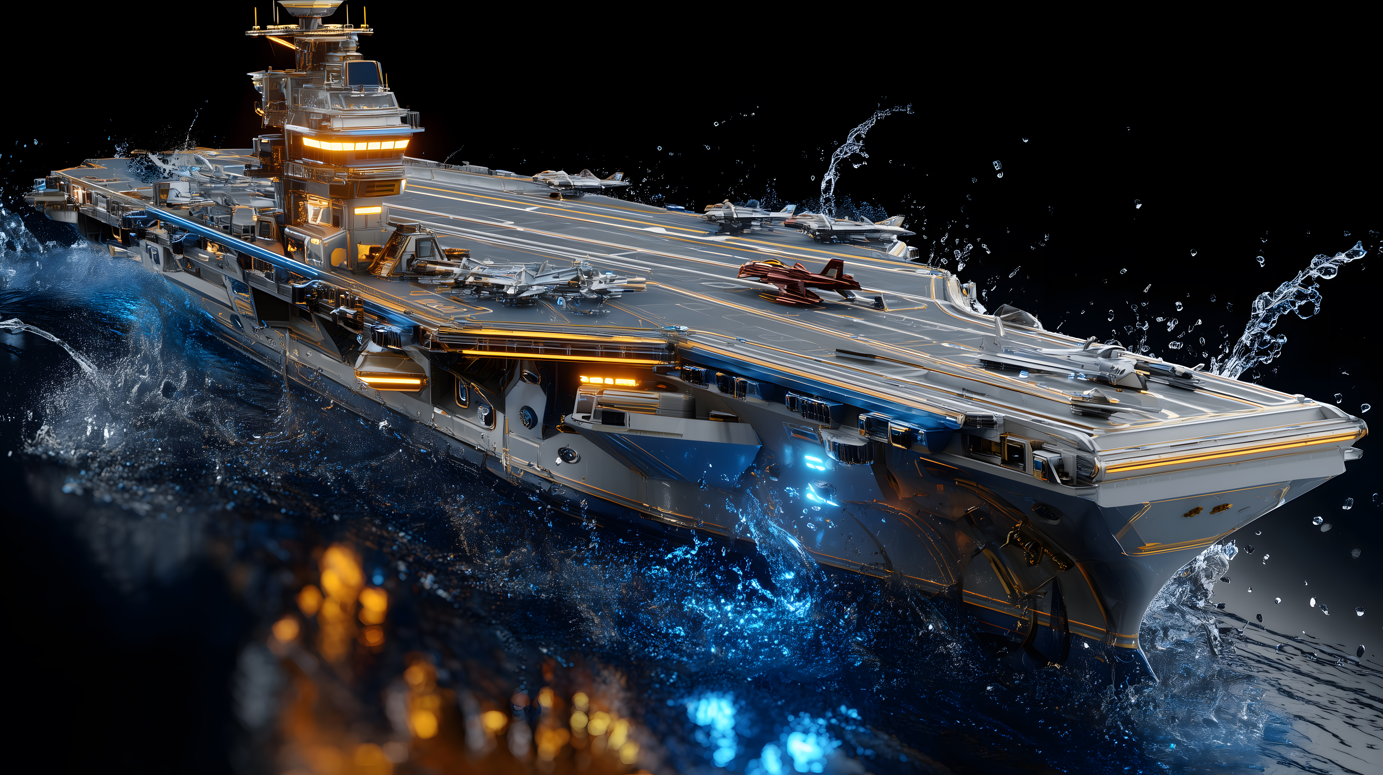 Das Bild zeigt einen hochdetaillierten 3D-Flugzeugträger, der auf stürmischer See dahintreibt. Das mächtige Kriegsschiff ist mit zahlreichen Beleuchtungselementen ausgestattet und reflektiert sich im aufgewühlten Wasser. Die Szenerie vermittelt einen beeindruckenden Eindruck von Kraft und Technologie. Dieses hochauflösende digitale Foto eignet sich hervorragend als Hintergrund oder Eyecatcher für Blogs, Newsletter, Social-Media-Kanäle oder Werbematerialien im Kontext von Technik, Militär oder maritimen Themen. Das Stockfoto steht unter einer Creative-Commons-Lizenz zur kostenlosen Verwendung zur Verfügung.