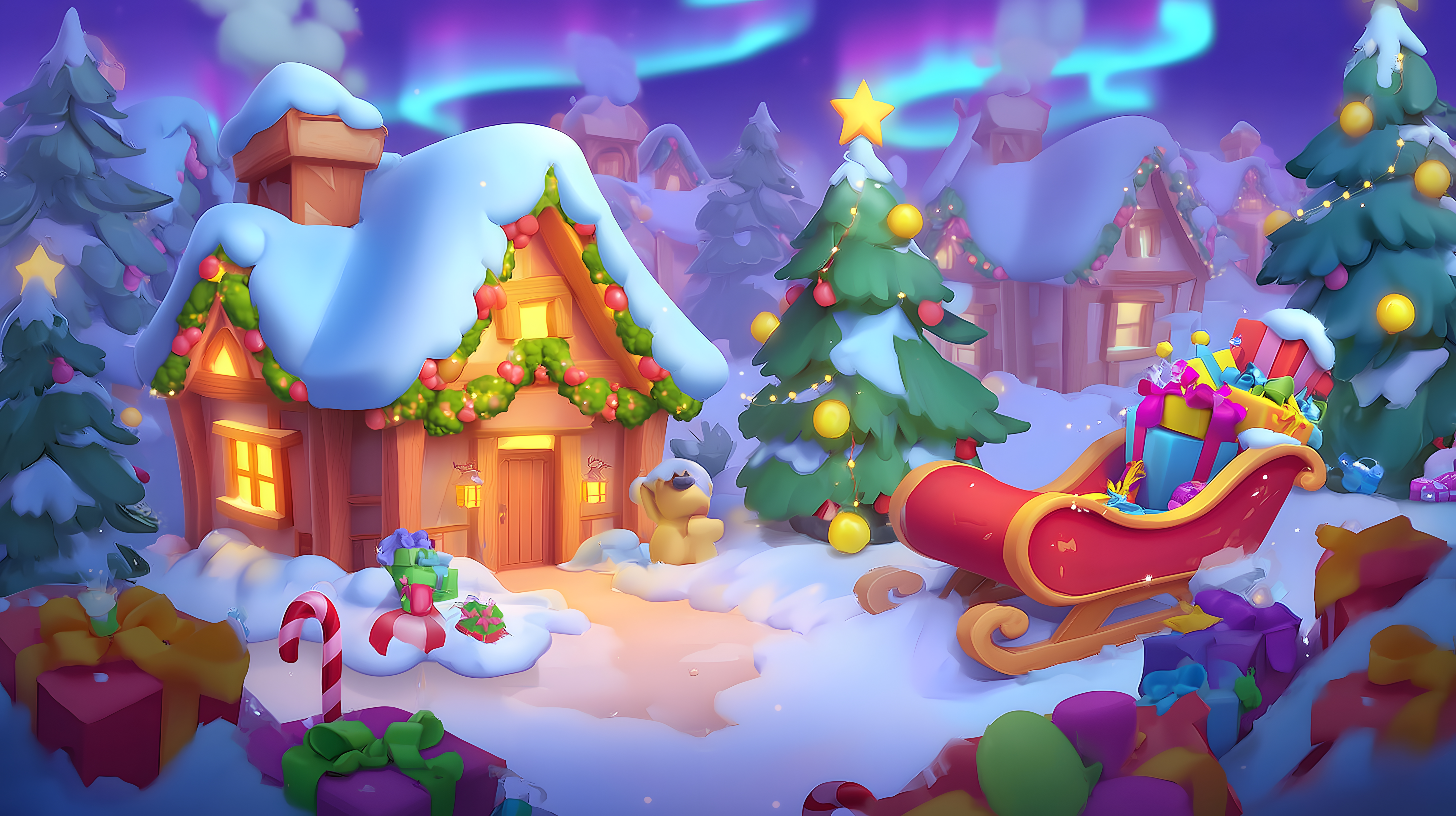 Das detailreiche Bild zeigt ein winterliches Weihnachtsdorf mit verschneiten Häusern, geschmückten Tannenbäumen und einem roten Schlitten voller Geschenke. Die Szenerie ist in warmen Tönen von Rot, Orange und Gelb gehalten, die durch die violetten und blauen Akzente des Nachthimmels und der Beleuchtung kontrastiert werden. Die Komposition mit den verschneiten Bäumen und Gebäuden vermittelt eine märchenhafte, festliche Stimmung.