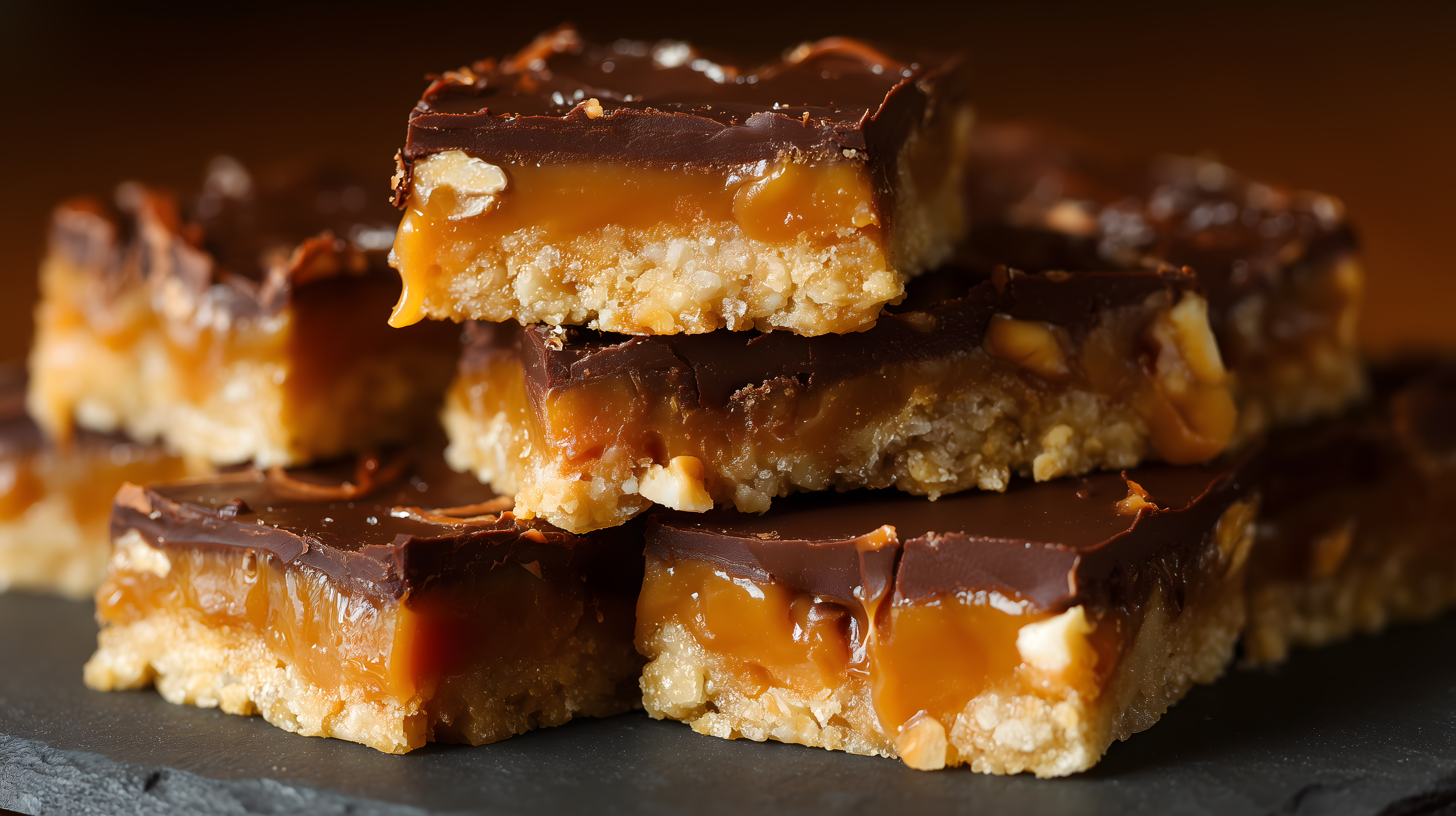 Dieses appetitliche Foto zeigt einen Stapel von leckeren Karamell-Schokoriegel mit einem knusprigen, goldbraunen Boden. Der Fokus liegt auf den reich verzierten Riegeln, die in kräftigen Braun- und Orangetönen schimmern. Die Textur der Oberfläche verspricht eine köstliche, cremige Füllung, die sich perfekt mit der knusprigen Kruste kombiniert. Dieses Stockfoto eignet sich hervorragend für den Einsatz in Rezeptbüchern, Dessertblogs, Social-Media-Posts oder Werbematerialien für Süßwaren und Snacks. Das hochauflösende Bild ist unter einer Creative-Commons-Lizenz frei verwendbar.