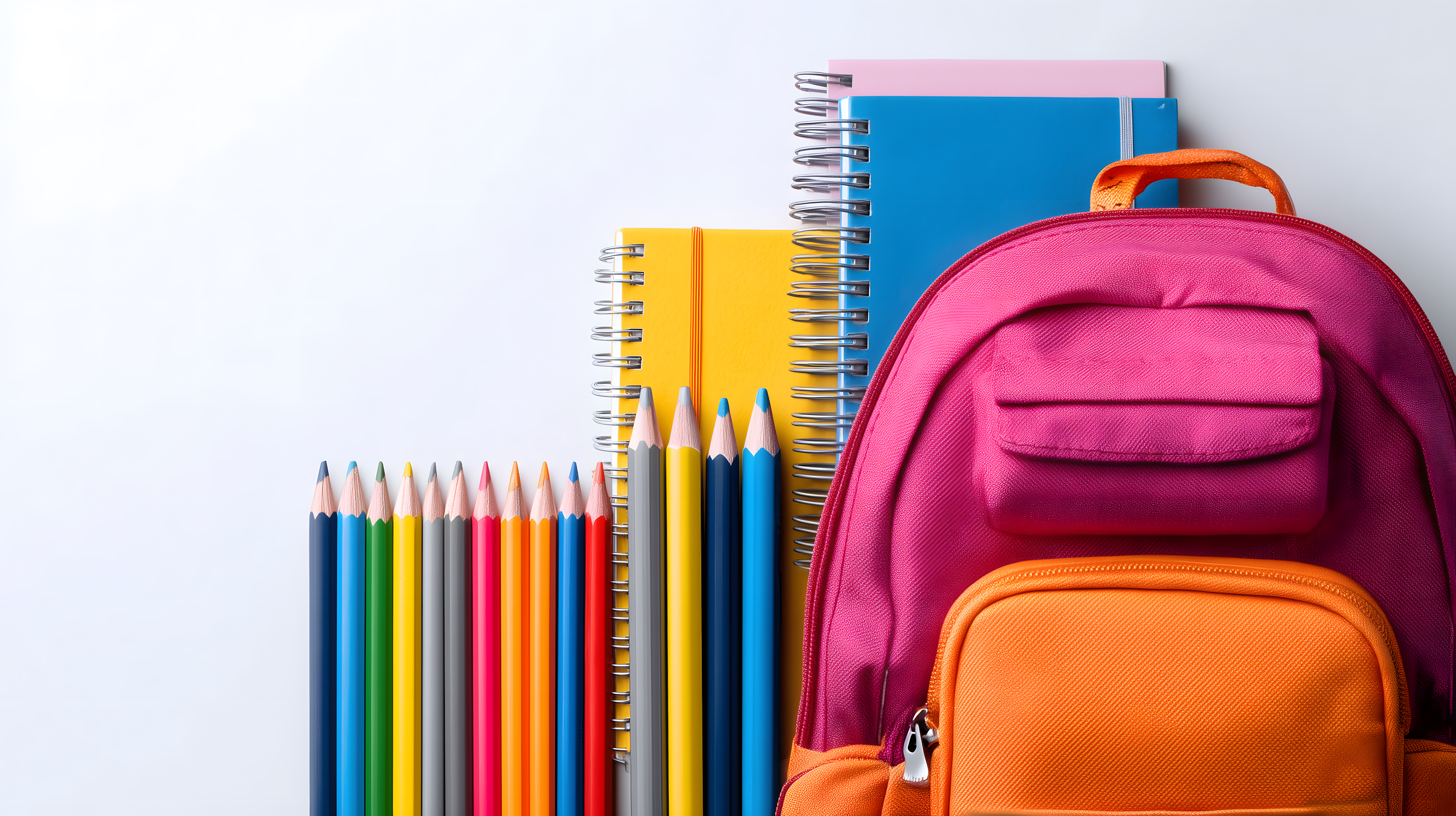 Das Bild zeigt eine Anordnung von Schulutensilien und einem Rucksack in lebendigen Farben auf weißem Hintergrund. Verschiedene Schreibwaren wie bunte Stifte, Notizblöcke und ein orangefarbener Rucksack sind kunstvoll platziert, um eine frische und einladende Komposition zu schaffen. Dieses hochauflösende Stockfoto eignet sich ideal für den Einsatz in Blogbeiträgen, Newslettern, Social-Media-Posts oder Werbematerialien rund um das Thema Schule, Lernen und Kreativität. Es steht unter einer Creative-Commons-Lizenz zur kostenlosen Nutzung zur Verfügung.