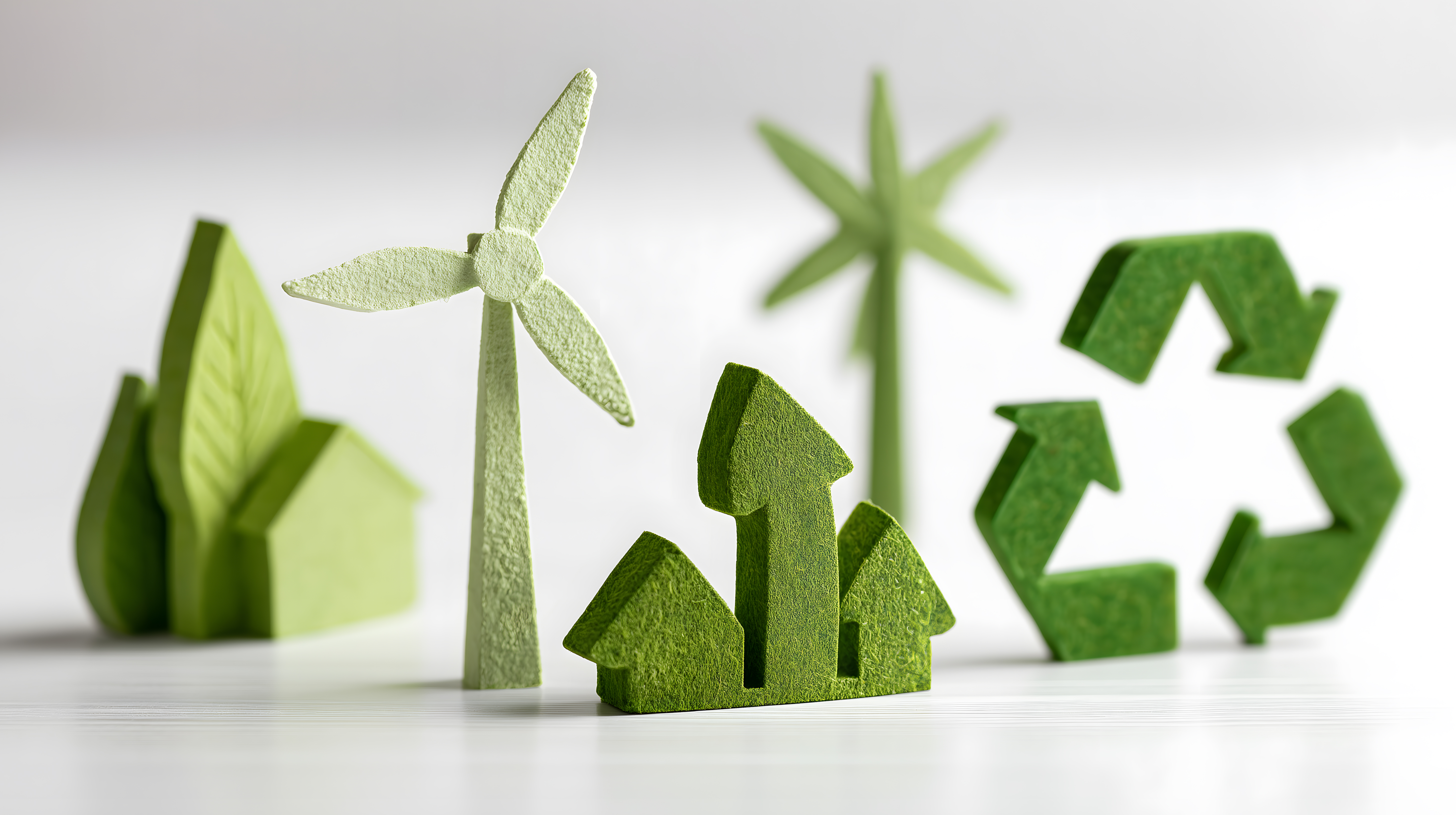 Dieses Foto zeigt eine Reihe von nachhaltigen Symbolen auf weißem Hintergrund. Das minimalistisch gestaltete Bild zeigt verschiedene grüne, geometrische Formen, die Konzepte wie Windkraft, Solarenergie, Recycling und Umweltschutz darstellen. Die Komposition ist klar und aufgeräumt, sodass die Objekte im Mittelpunkt stehen und dem Betrachter Raum zum Nachdenken lassen. Dieses Stockfoto eignet sich hervorragend für den Einsatz in Blogbeiträgen, Newslettern oder Werbekampagnen rund um Nachhaltigkeit, Ökologie und erneuerbare Energien. Das hochauflösende Bild steht unter der Creative-Commons-Lizenz zur freien Nutzung zur Verfügung.