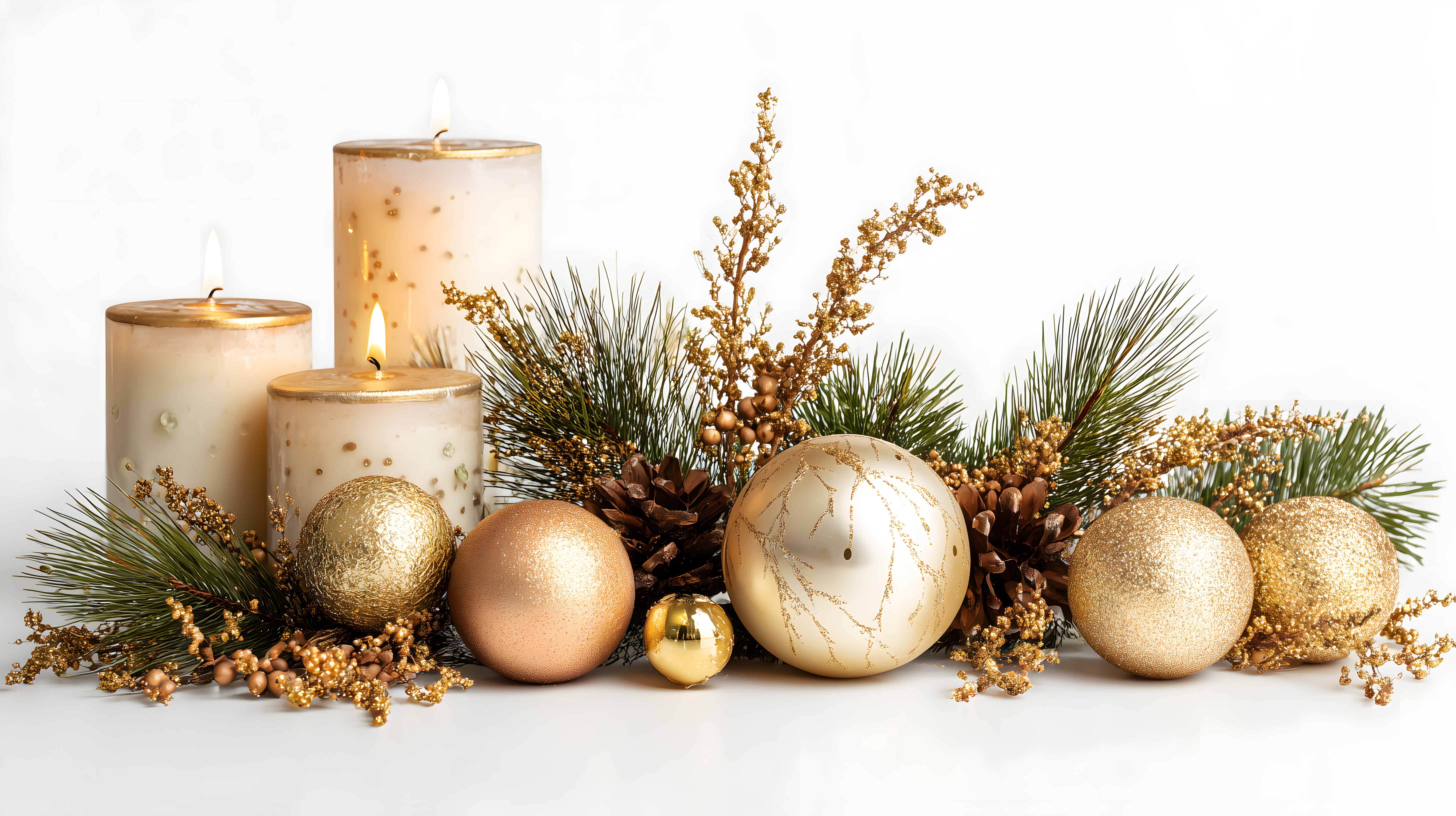 Dieses Foto zeigt eine stimmungsvolle Weihnachtsdekoration in Gold und Grün auf einem weißen Hintergrund. Im Vordergrund sind mehrere Kerzen in unterschiedlichen Größen zu sehen, einige davon mit Glitzer-Effekt. Dazu kommen goldene Weihnachtskugeln, Zapfen und Tannenzweige, die eine natürliche, festliche Atmosphäre schaffen. Die Komposition ist elegant und hochwertig, sodass sich das Bild perfekt für verschiedene Einsatzbereiche eignet - sei es als Hintergrundbild für einen Blogbeitrag, ein Newsletter-Layout oder einen Social-Media-Post zu den Feiertagen. Dieses kostenlose Stockfoto in hoher Auflösung steht unter einer Creative-Commons-Lizenz zur Verfügung.
