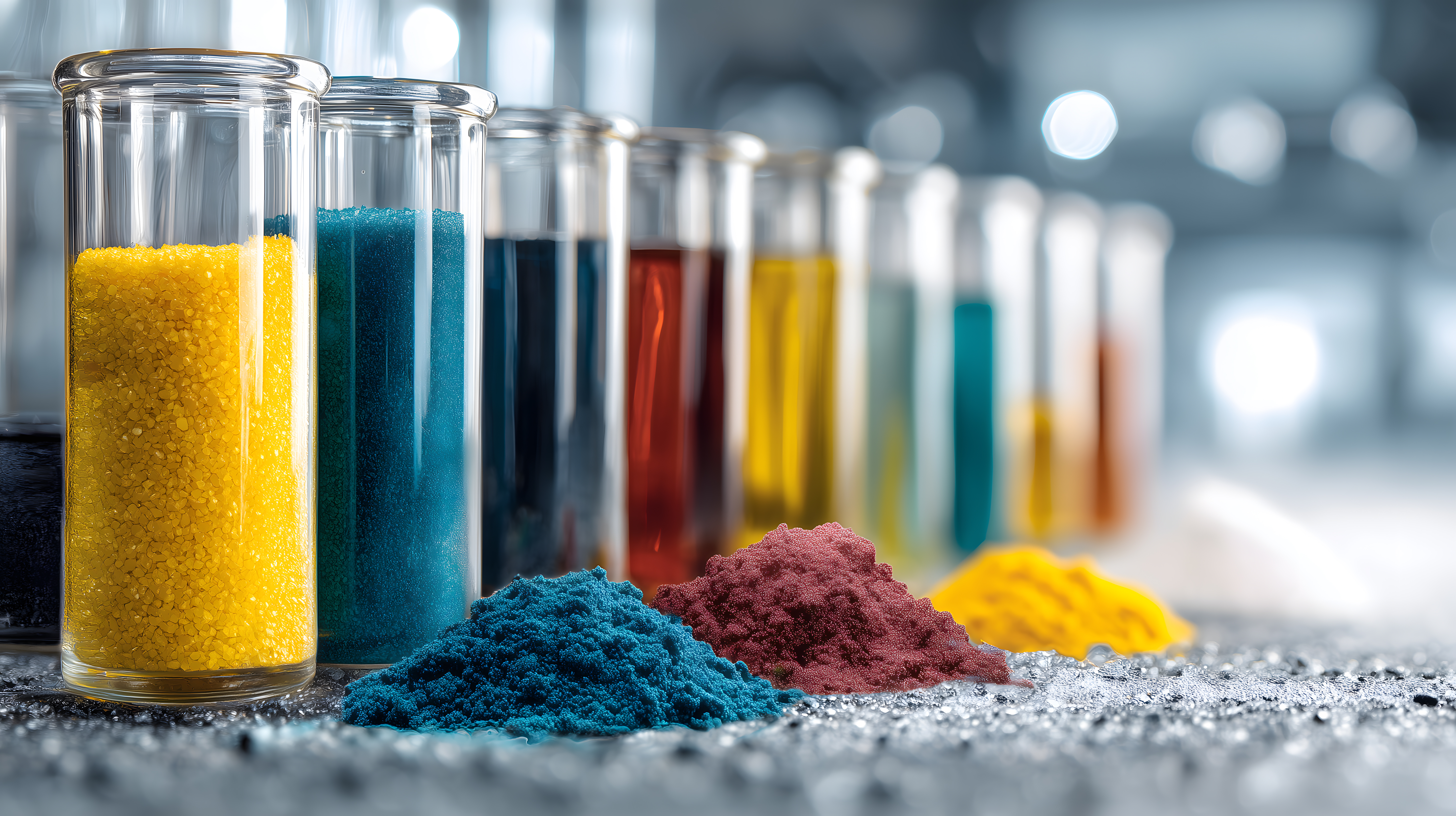 Das Bild zeigt eine Reihe von Laborgläsern gefüllt mit farbigen Pulvern und Granulaten. Die Gläser sind unterschiedlich gefüllt mit gelben, blauen, roten und grünen Substanzen, die an chemische Reaktionen oder Experimente erinnern. Die Anordnung der Gläser und Pulver verleiht dem Bild eine ästhetische Wirkung mit starken Kontrasten und Farben. Dieses Stockfoto eignet sich hervorragend für Beiträge zu Themen wie Wissenschaft, Forschung, Bildung oder Chemie. Es ist in hoher Auflösung und unter einer Creative-Commons-Lizenz frei nutzbar.