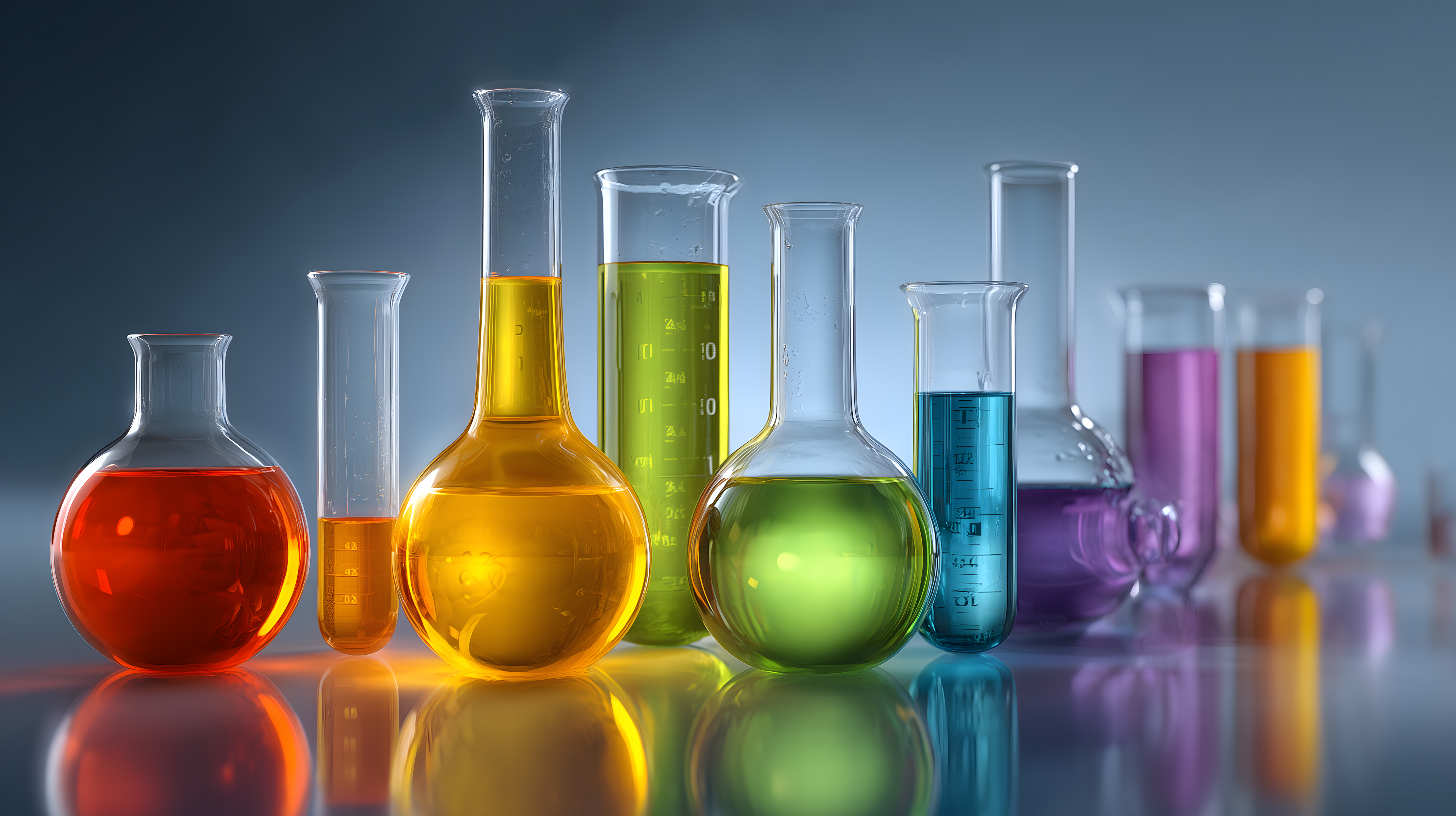 Diese hochaufgelöste Studiofotografie zeigt eine Vielzahl an Laborgefäßen gefüllt mit farbigen Flüssigkeiten. Die Glasgefäße in unterschiedlichen Formen und Größen, wie Reagenzgläser, Messkolben und Flaschen, stehen vor einem schlichten, dunklen Hintergrund. Die intensiven Farben der Lösungen, von rot und gelb bis grün und blau, erzeugen einen wissenschaftlichen und experimentellen Eindruck. Dieses Stockfoto ist ideal geeignet für Layouts und Designs rund um Themen wie Chemie, Forschung, Bildung oder Medizin, sei es für Blogbeiträge, Werbematerial oder Social-Media-Kanäle. Das Bild ist unter einer Creative-Commons-Lizenz verfügbar und kann kostenfrei heruntergeladen werden.