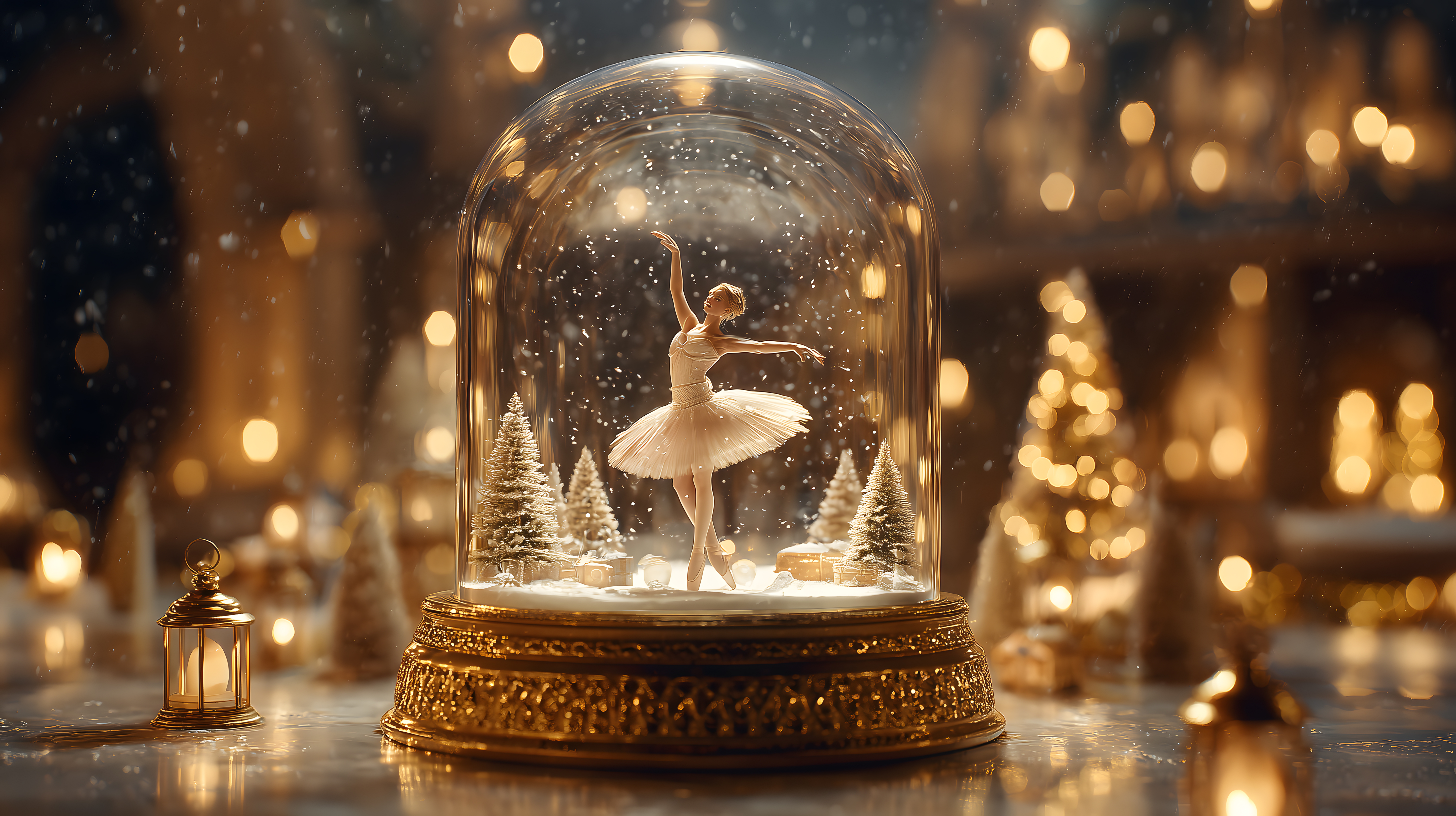 Das Bild zeigt eine Ballerina in einer festlichen Schneekugel. Die Ballerina schwebt elegant in einer winterlichen Landschaft voller glitzernder Schneeflocken und Weihnachtsbäume. Die Szene ist in warme, goldene Töne getaucht, die einen feierlichen, märchenhaften Charakter verleihen. Das Foto hat eine stimmungsvolle, nostalgische Ausstrahlung und eignet sich hervorragend als dekoratives Element in Weihnachtsdekorationen, Feiertags-Grußkarten oder Blogbeiträgen. Als hochauflösendes, kostenfreies Stockfoto unter einer Creative-Commons-Lizenz kann es für private und kommerzielle Zwecke verwendet werden.
