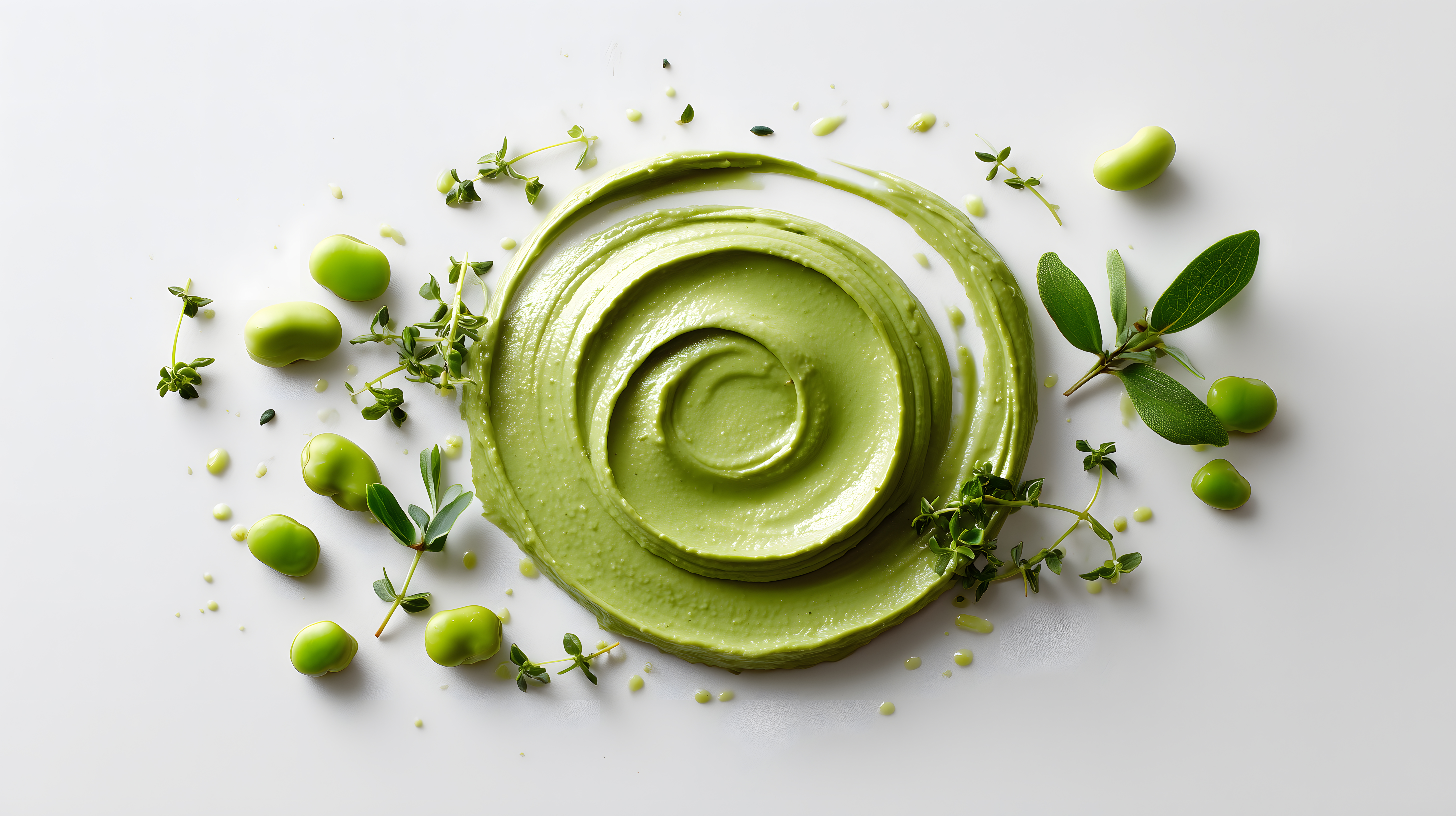 Dieses frische, appetitlich angerichtete Foto zeigt eine köstliche, spiralförmige vegane Fava-Bohnencreme, umgeben von grünen Kräutern und Gewürzen. Die leuchtend grüne Farbe und die dekorative Präsentation machen das Bild zu einem perfekten Eye-Catcher für Food-Beiträge in Blogs, Newslettern oder sozialen Medien. Das hochauflösende Stockfoto ist unter einer Creative-Commons-Lizenz frei verwendbar und verleiht Ihren Projekten einen natürlichen, gesunden Look.