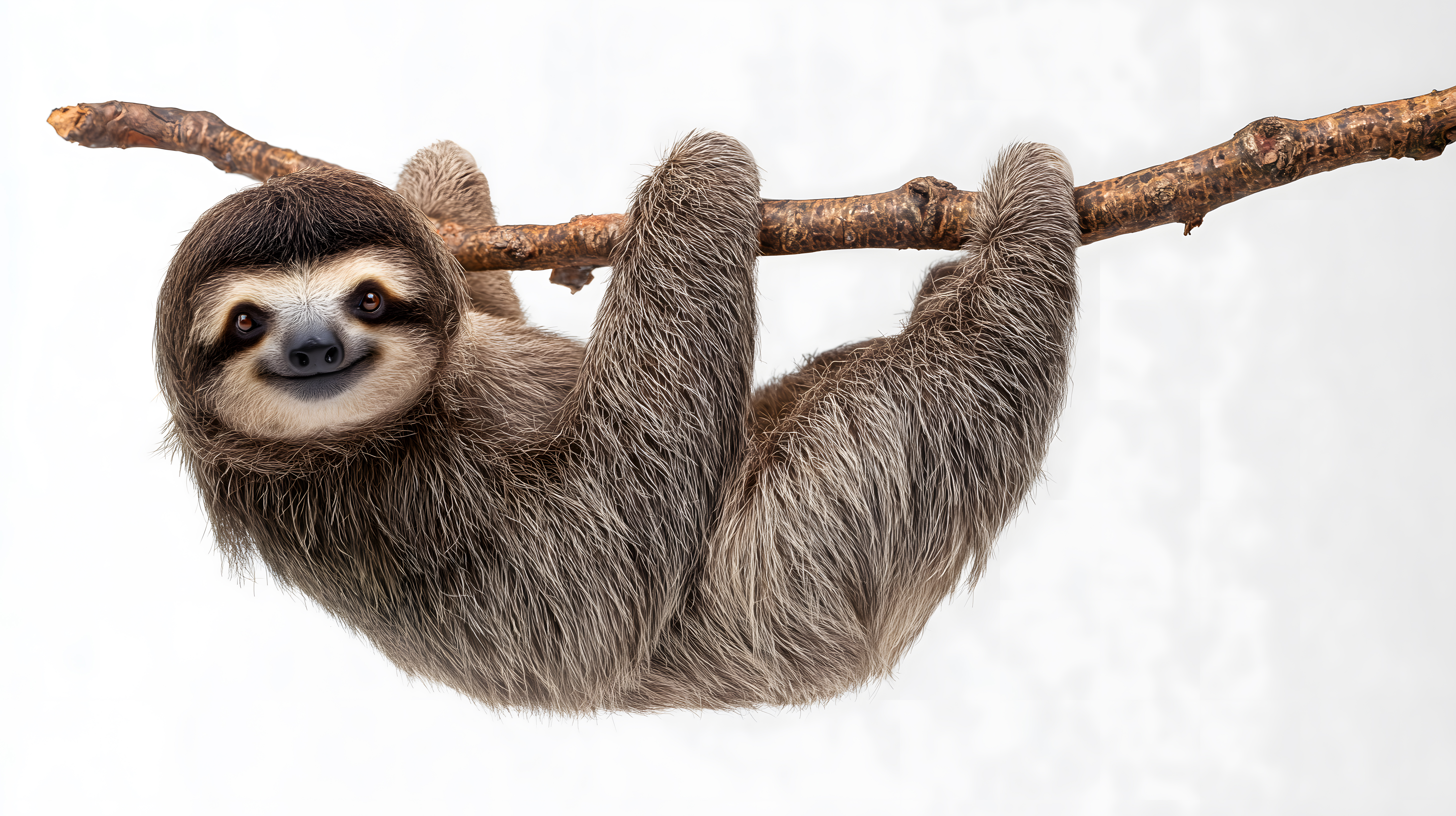 Das Bild zeigt ein detailliertes Porträt eines Faultiers, das sich entspannt an einem Ast festhält. Das Faultier hat einen flauschigen, grau-braunen Fellmantel und einen typischen, ausdrucksstarken Gesichtsausdruck mit großen Augen. Die Perspektive ist eine Nahaufnahme, die die Textur und Feinheiten des Fells sowie die Körperhaltung des Tieres in voller Schärfe zeigt.