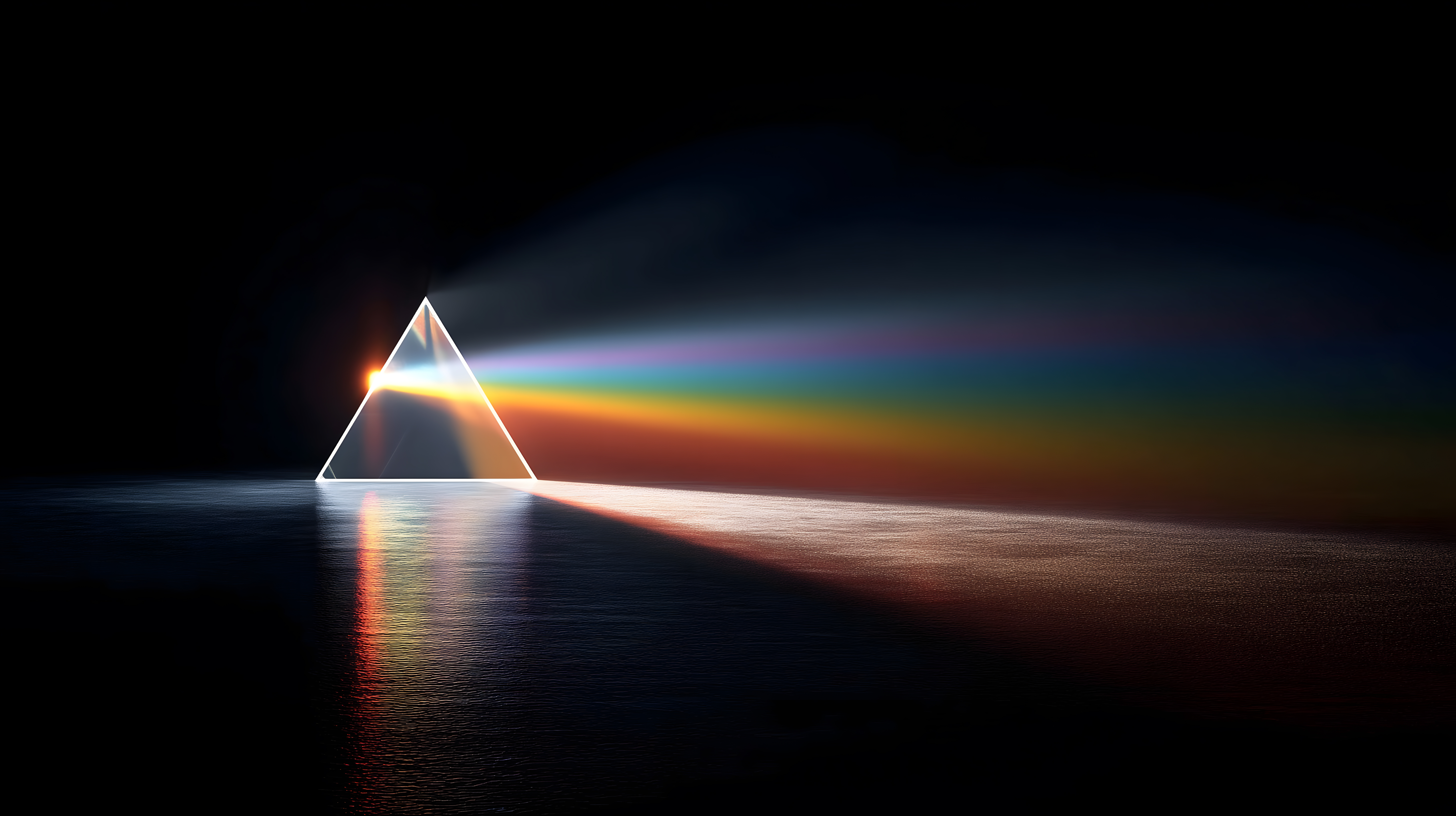 Das Bild zeigt ein dramatisches, abstraktes Motiv mit einem dreieckigen Prisma, das einen spektakulären Lichtstrahl auf einer dunklen Meeresoberfläche erzeugt. Die Brechung des Lichts durch das Prisma lässt ein farbenfrohes Spektrum entstehen, das sich in der Wasserfläche widerspiegelt. Die Komposition ist stimmungsvoll und faszinierend, mit einer minimalistischen Gestaltung, die den Fokus ganz auf das Lichtspiel richtet. Dieses hochauflösende Stockfoto mit Creative-Commons-Lizenz eignet sich hervorragend für den Einsatz in Blogs, Newslettern, Social-Media-Posts oder als dekoratives Hintergrundbild in Präsentationen und Websites.